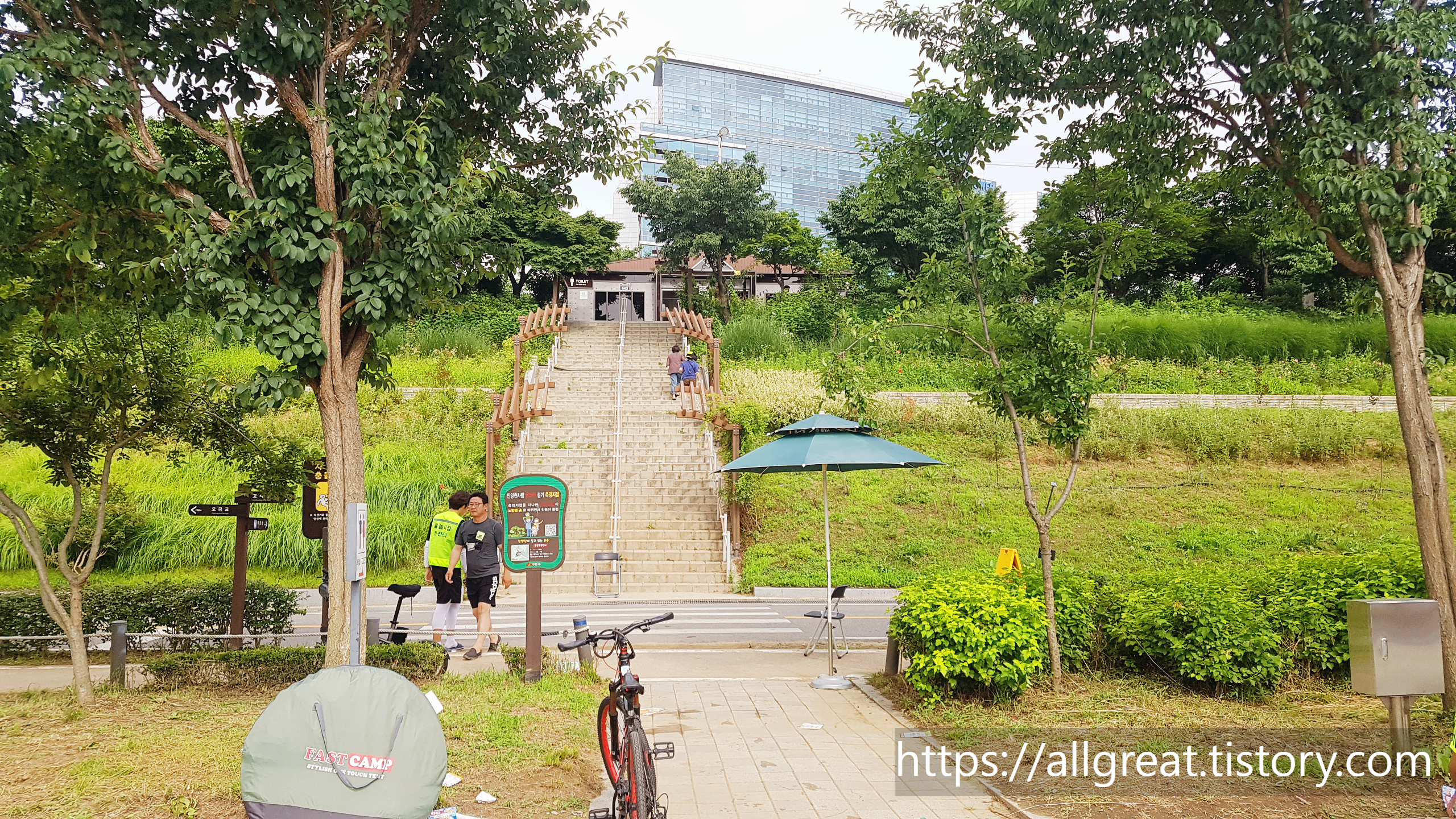 물놀이장에서 화장실을 가려면, 자전거전용 도로를 건너서 계단으로 올라가야 한다. 위 사진에서 계단 꼭대기에 보이는 건물이 화장실이다.