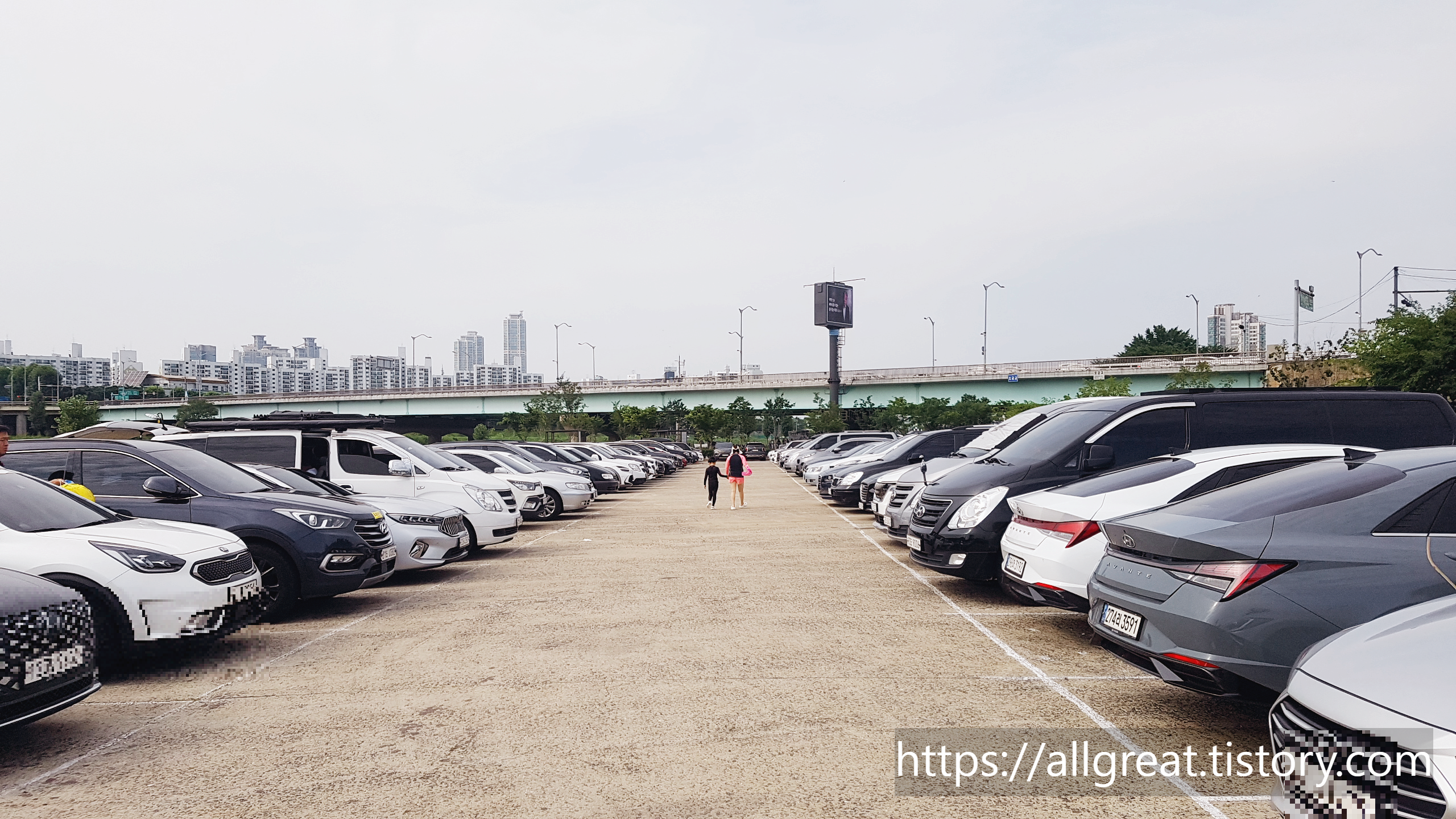 구로구 안양천 물놀이장 주차장은 주차공간이 매우 넓고 여유 있다. 그럼에도 물놀이장과 가장 가까운 곳에 주차하려고 주차라인 아닌 공간에 주차하는 얌체 운전자들 때문에 주차장 출입구는 복잡하고 혼잡했다.