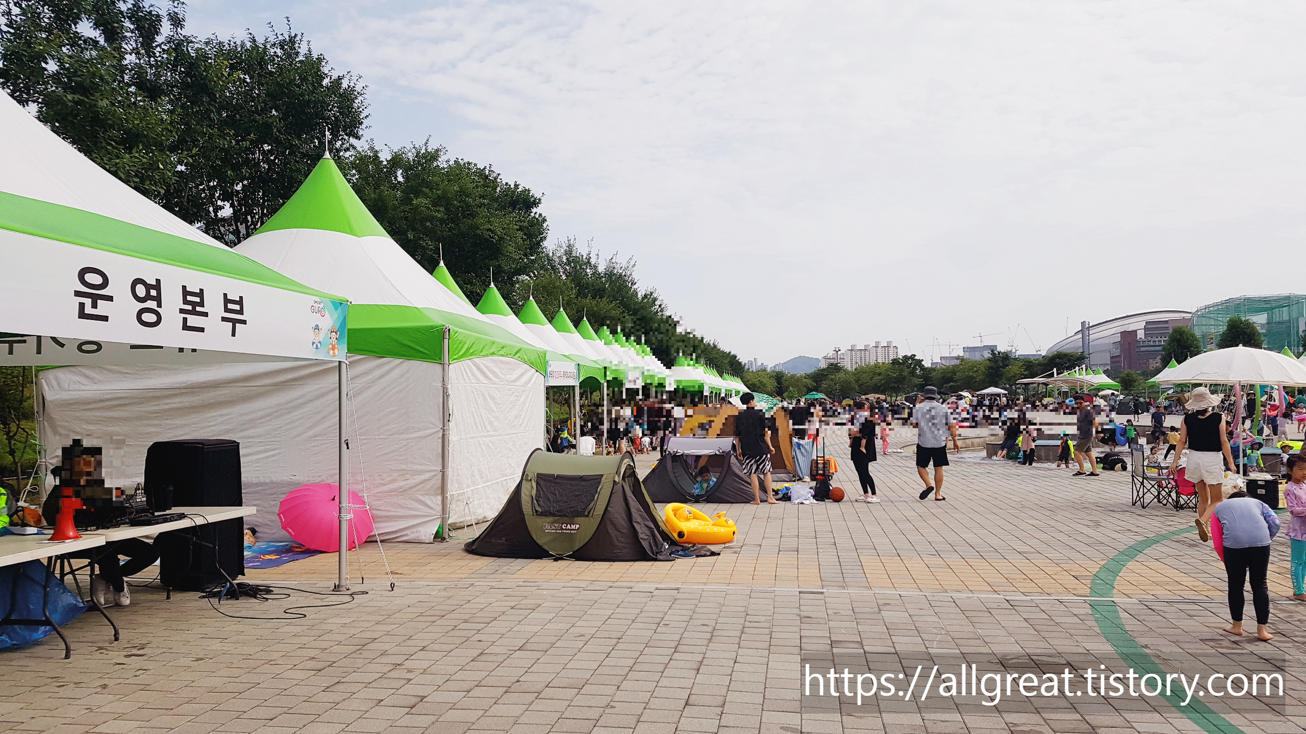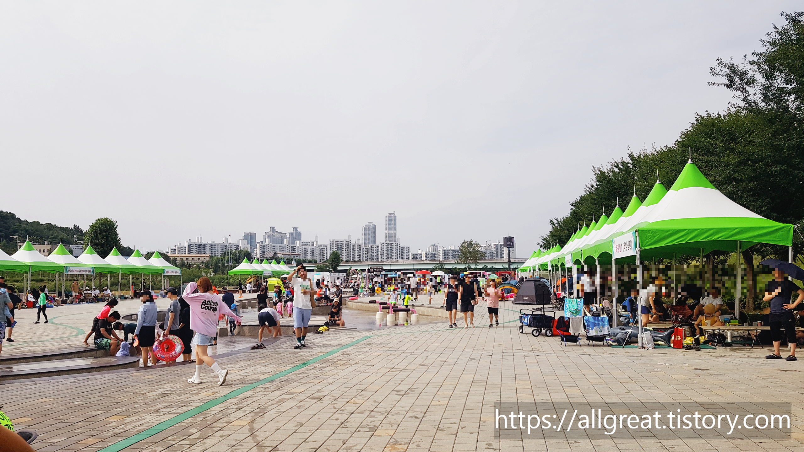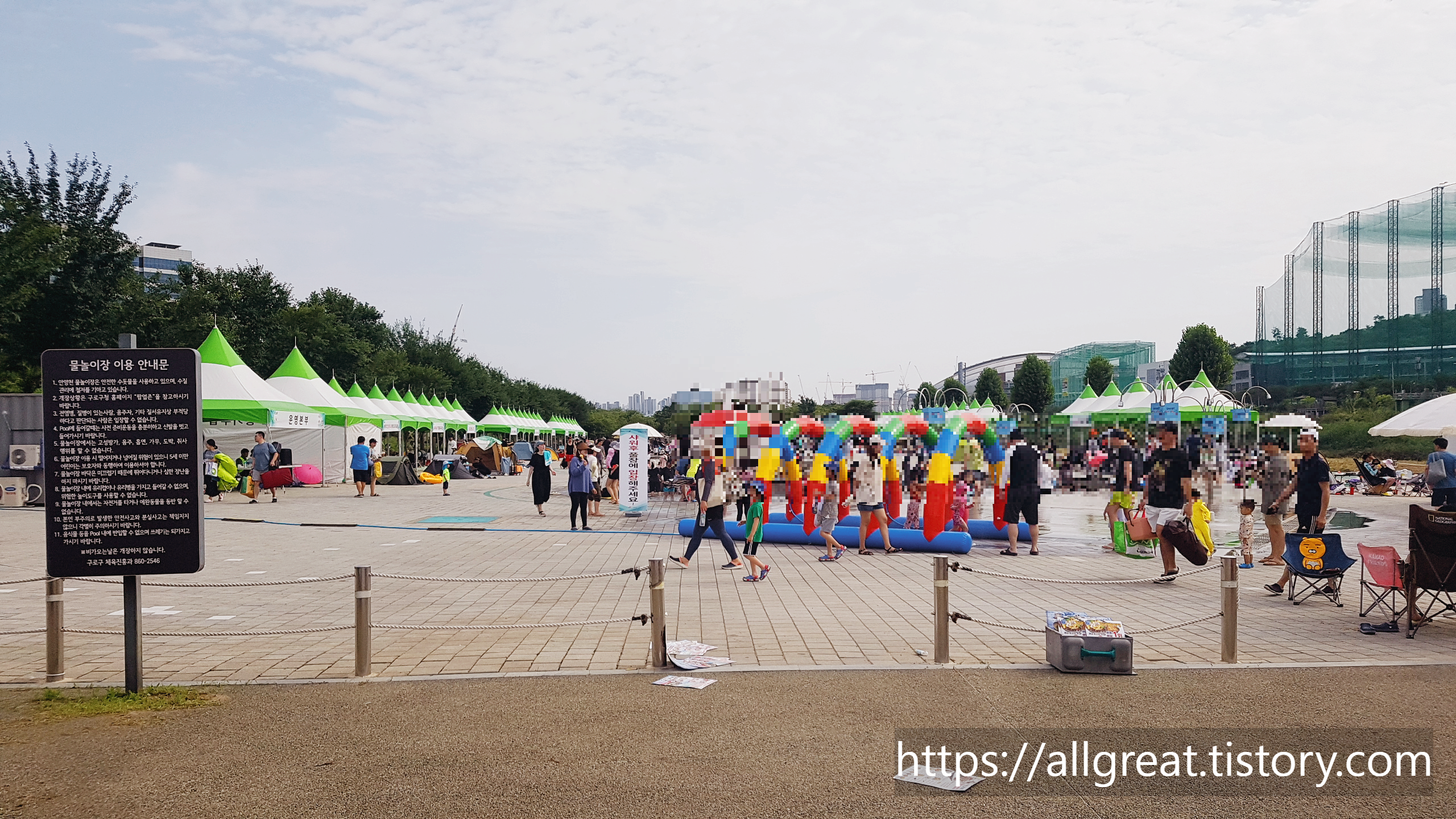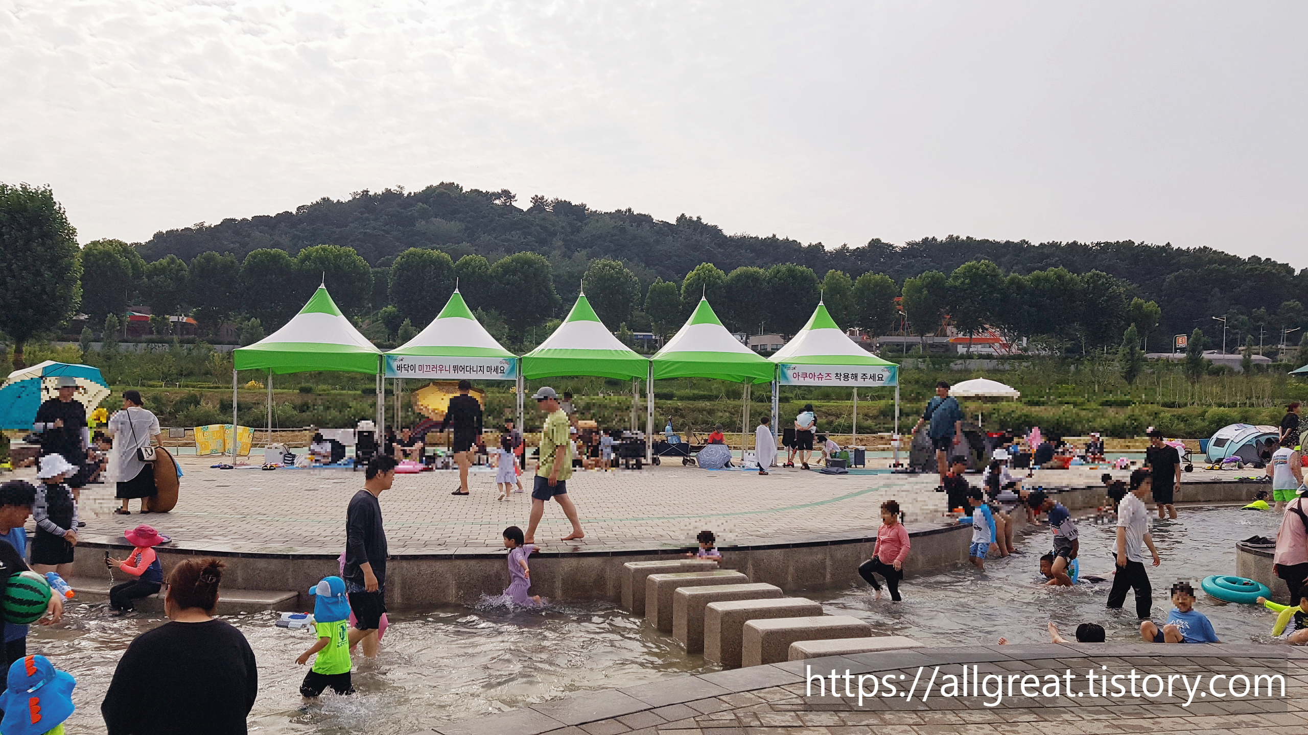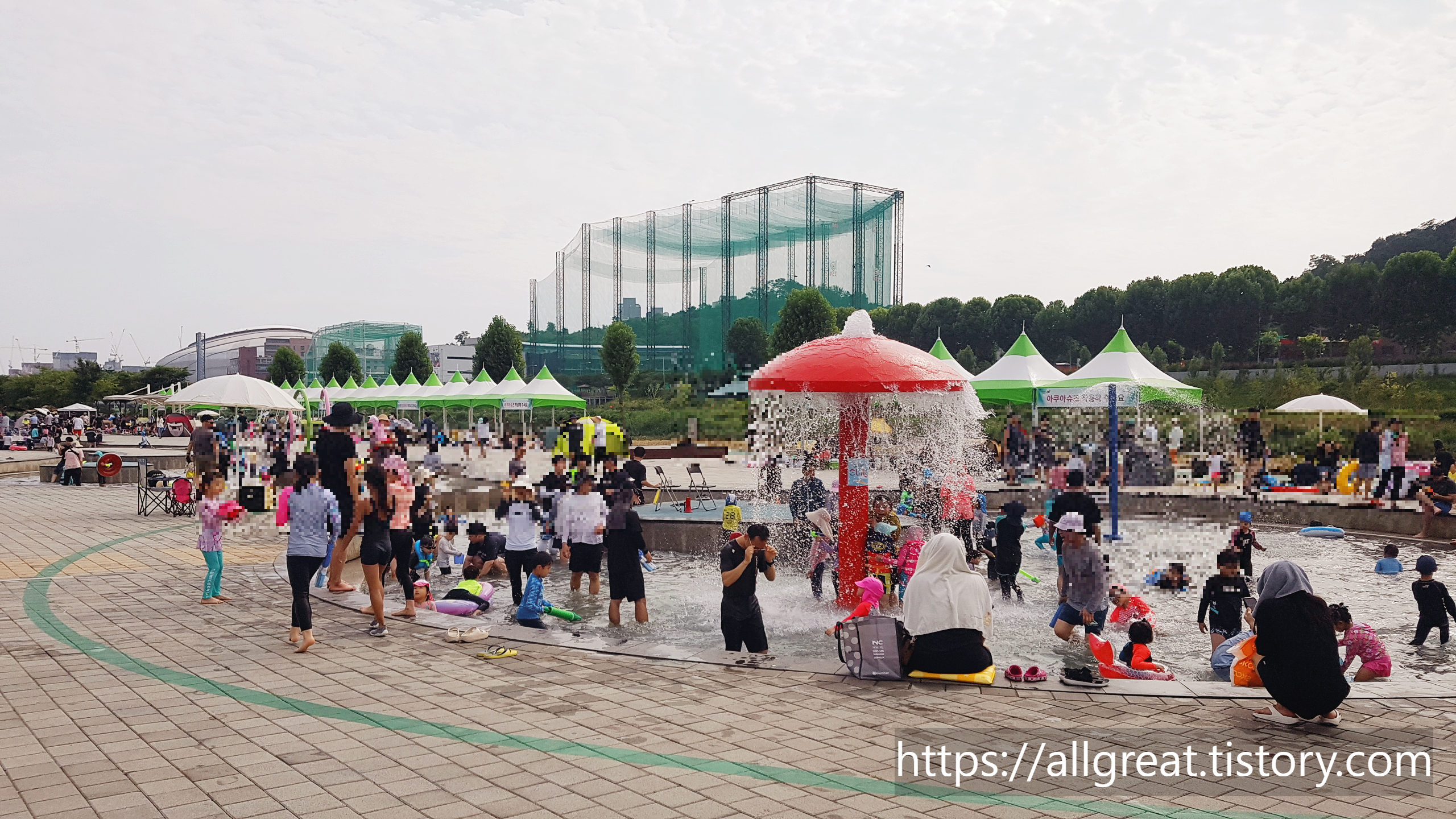 무료로 설치되었는 뾰족한 콘모양의 그늘막은 부지런히 일찍 방문한 사람들이 이미 차지하여 빈자리가 없었다. 우리 가족은 점심 무렵에 도착하였는데, 주말이라서 그런지 워터파크처럼 사람들로 북적거렸다.