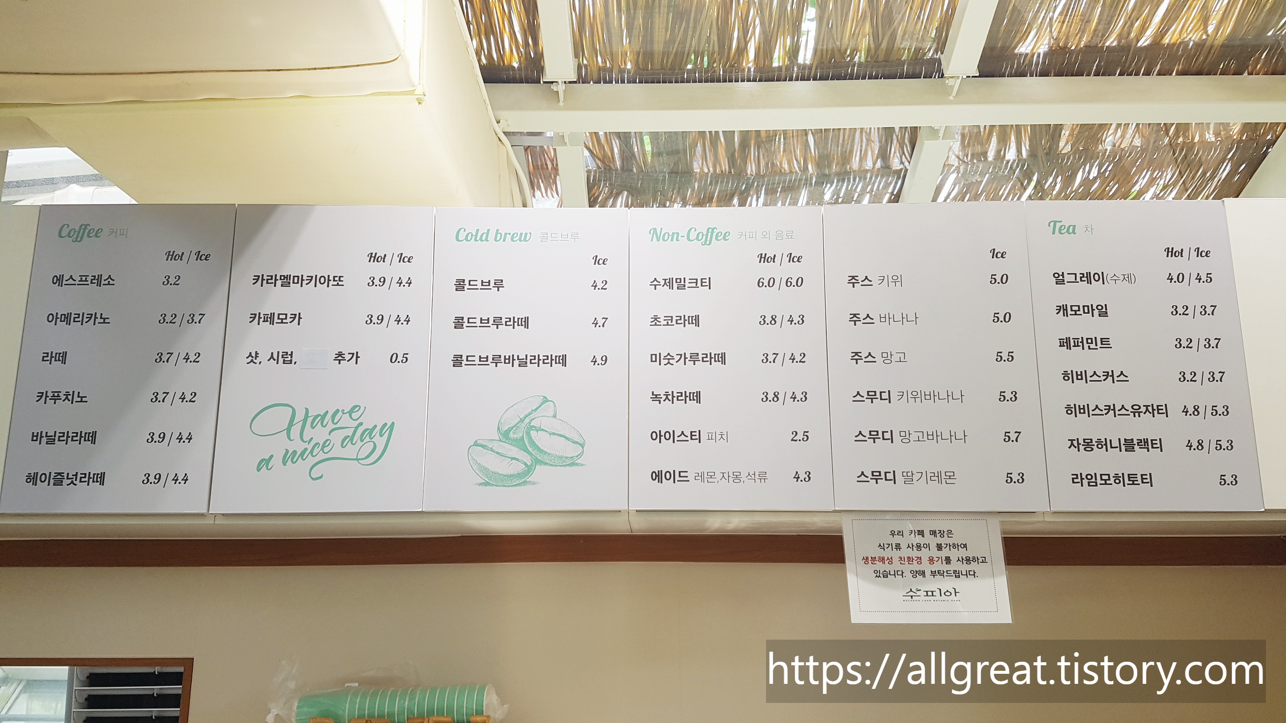 이 수피아 식물원 안에는 수피아카페가 있는데, 식물원 안에 있는 카페라서 빼어난 경치와 상쾌하고 맑은 공기를 마실 수 있는 나만 알고 싶은 카페다.