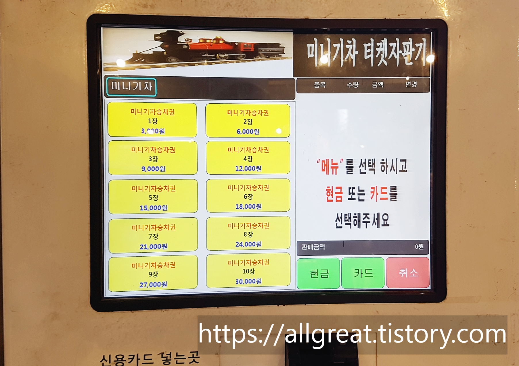 미니기차(미니트레인) 이용료는 연령에 상관없이 1인당 3,000원이다. (12개월 이하 무료) 결재방법은 카드와 현금 모두 가능하다. 티켓 결재창구는 없으며, 티켓자판기(키오스크 무인결제)를 이용하여 결재와 티켓발급을 진행하면 된다.