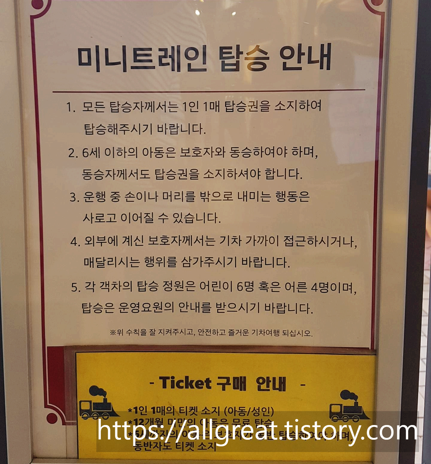 - 아기 포함 모든 연령대가 탑승이 가능하나, 6세 이하는 반드시 보호자가 동승해야 한다.