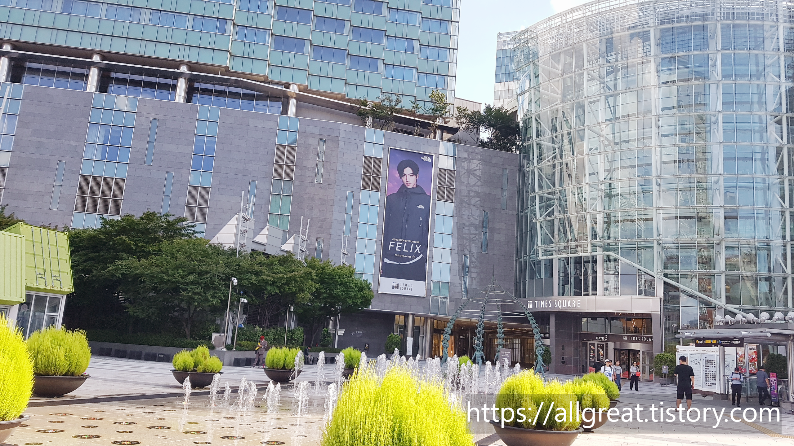 영등포 신세계백화점과도 연결되어 있는 타임스퀘어의 출입구는 정말 많지만, 바닥분수와 광장에 마련되어 있는 정문은 영등포소방서 맞은편에 위치한다.