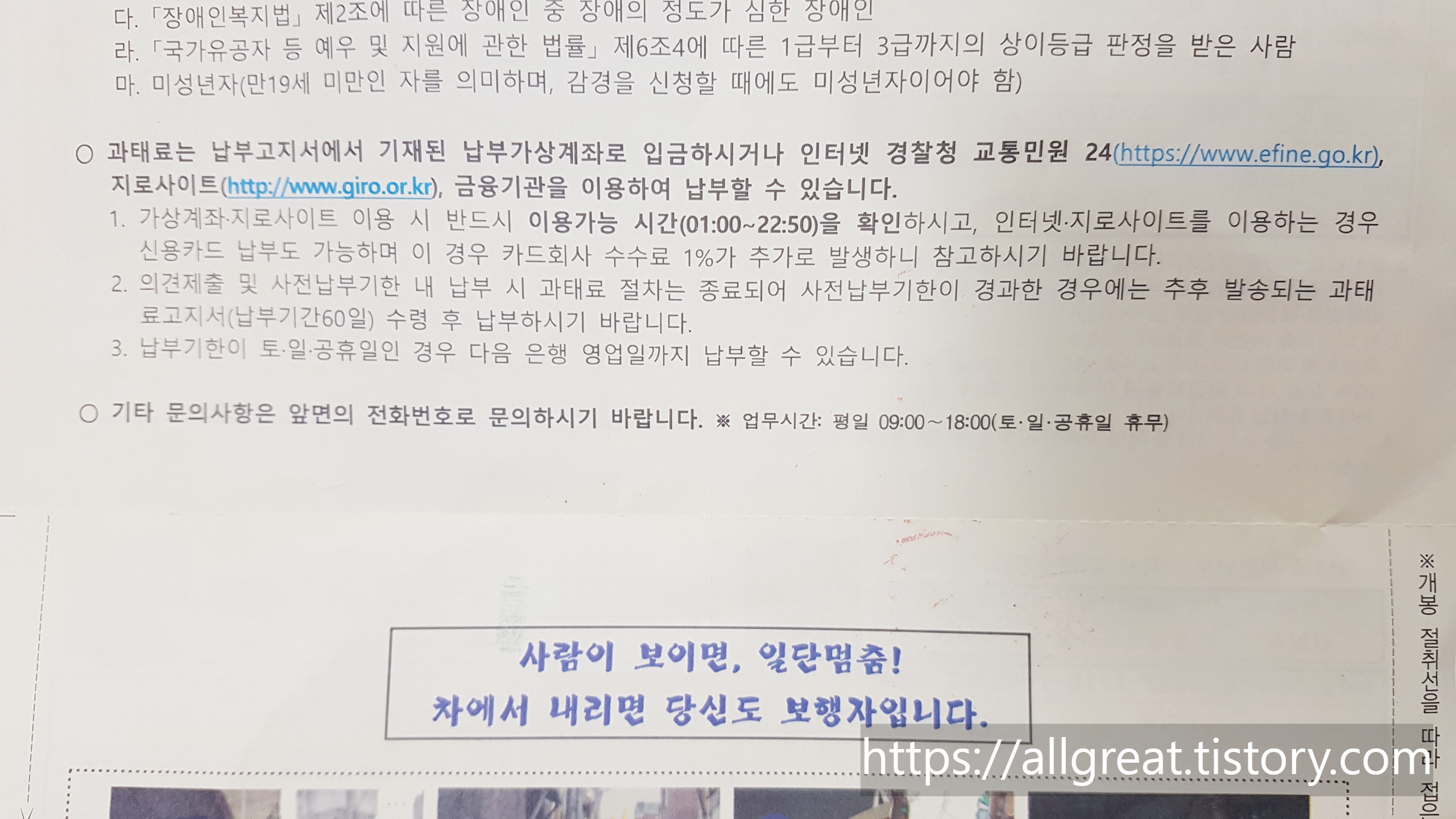 과태료납부 방법은 우편물로 받은 과태료통지서에 친절하게 잘 설명되어 있다. 과태료 납부고지서에 기재된 가상계좌로 입금하거나 인터넷 경찰청 교통민원24 또는 지로사이트에 들어가서 납부할 수 있다.
