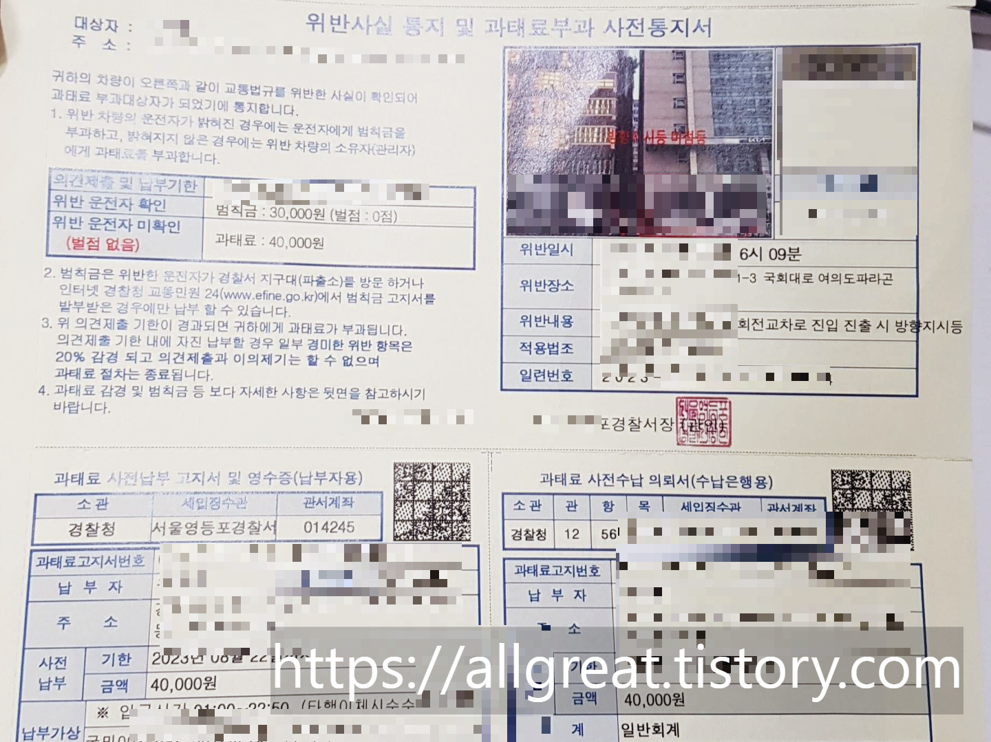경찰서 과태료(범칙금) 사전통지서 전혀 반갑지 않은 우편물이 영등포경찰서장 명의로 보내왔다. 잘못한 거 하나 없는데 왜 나에게 경찰이 우편물을 보내왔을까 의아해하며 "잘못 보냈겠지~ 설