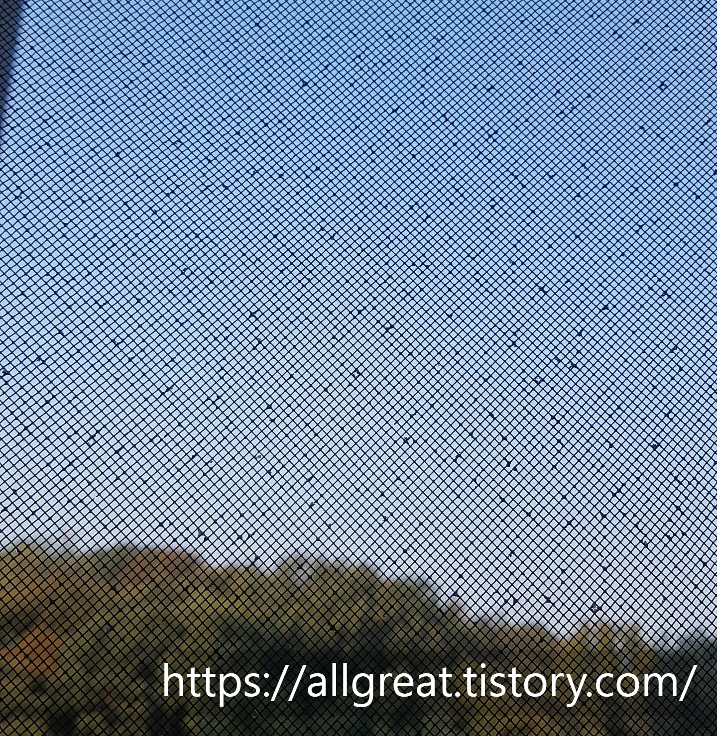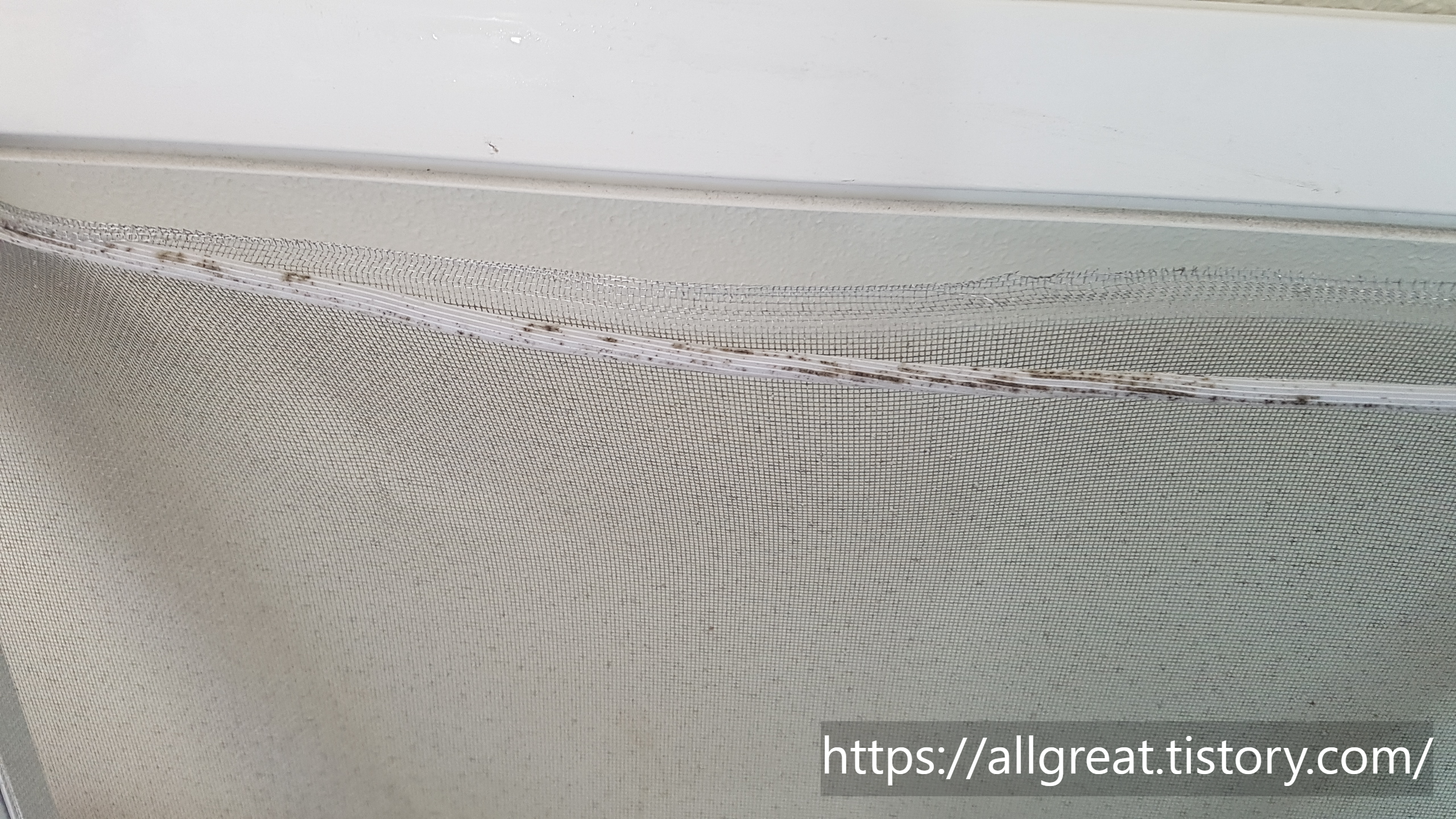 이전까지 사용했었던 배란다 창문틀 샤시방충망의 모습이다. 촘촘한 거미줄에 붙잡힌 것처럼 모기, 날파리, 풀벌레 등 온갖 곤충들이 방충망 틈새에 끼여서 눌어붙었다.