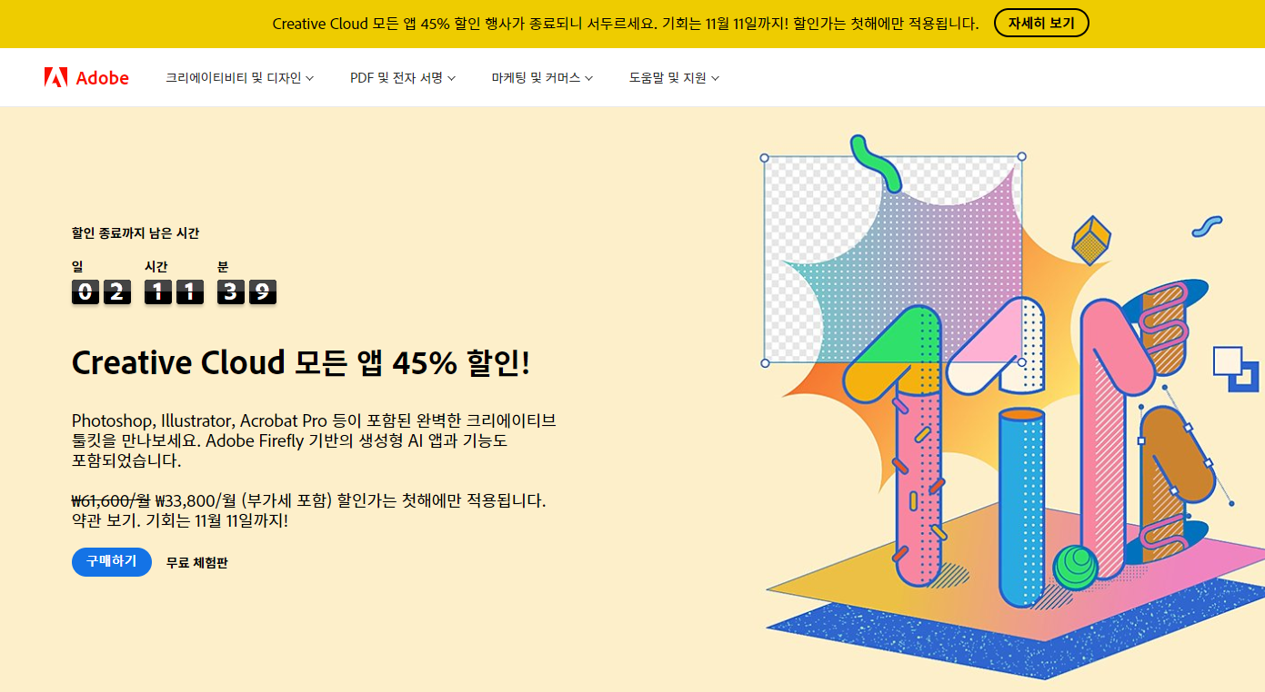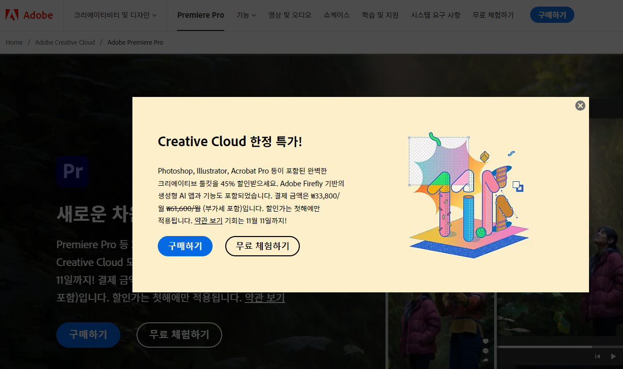 프리미어프로를 클릭하자마자 '크리에이티브 클라우드' 한정 특가 팝업창이 뜬다. 어도비에서 제공하는 많은 프로그램을 11월 11일까지 결재 시 파격적인 가격으로 사용할 수 있다는 내용이다.