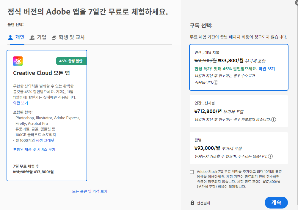 할인 이용료 가격은 월 33,800원이며, 할인 가격은 첫해만 적용받을 수 있다. 따라서 지금 당장 결재하여 어도비클라우드 서비스를 가입해도 올해 11월과 12월 단 2개월만 할인가격으로 사용할 수 있고, 내년 1월부터는 정가 61,600원에 서비스를 이용해야 한다.