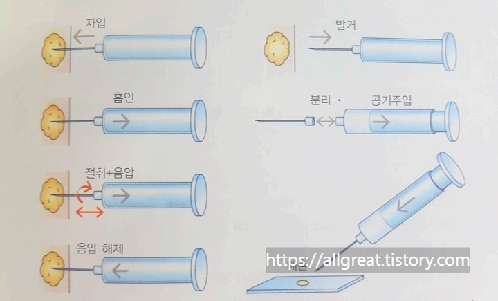 갑상선 세침검사(fnac) 과정은 자입, 흡인, 절취, 음압해제, 발거, 배출, 도말, 고정 순으로 진행된다.