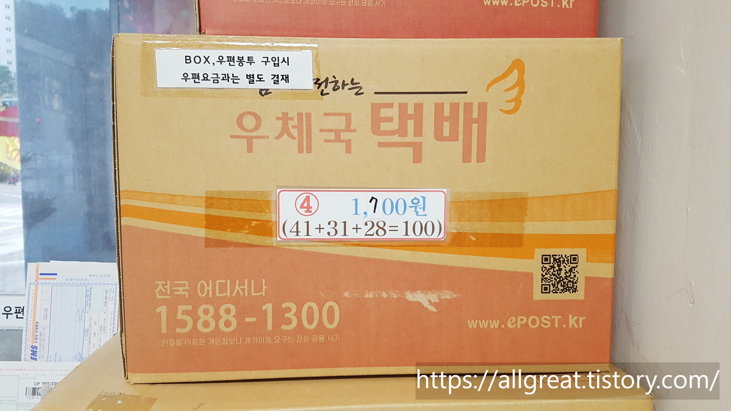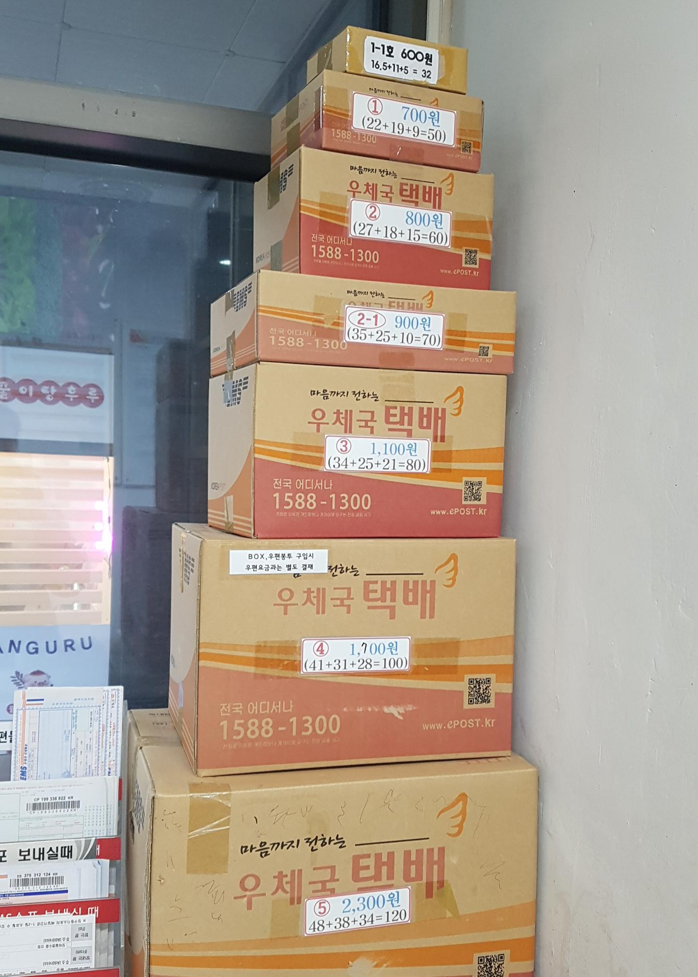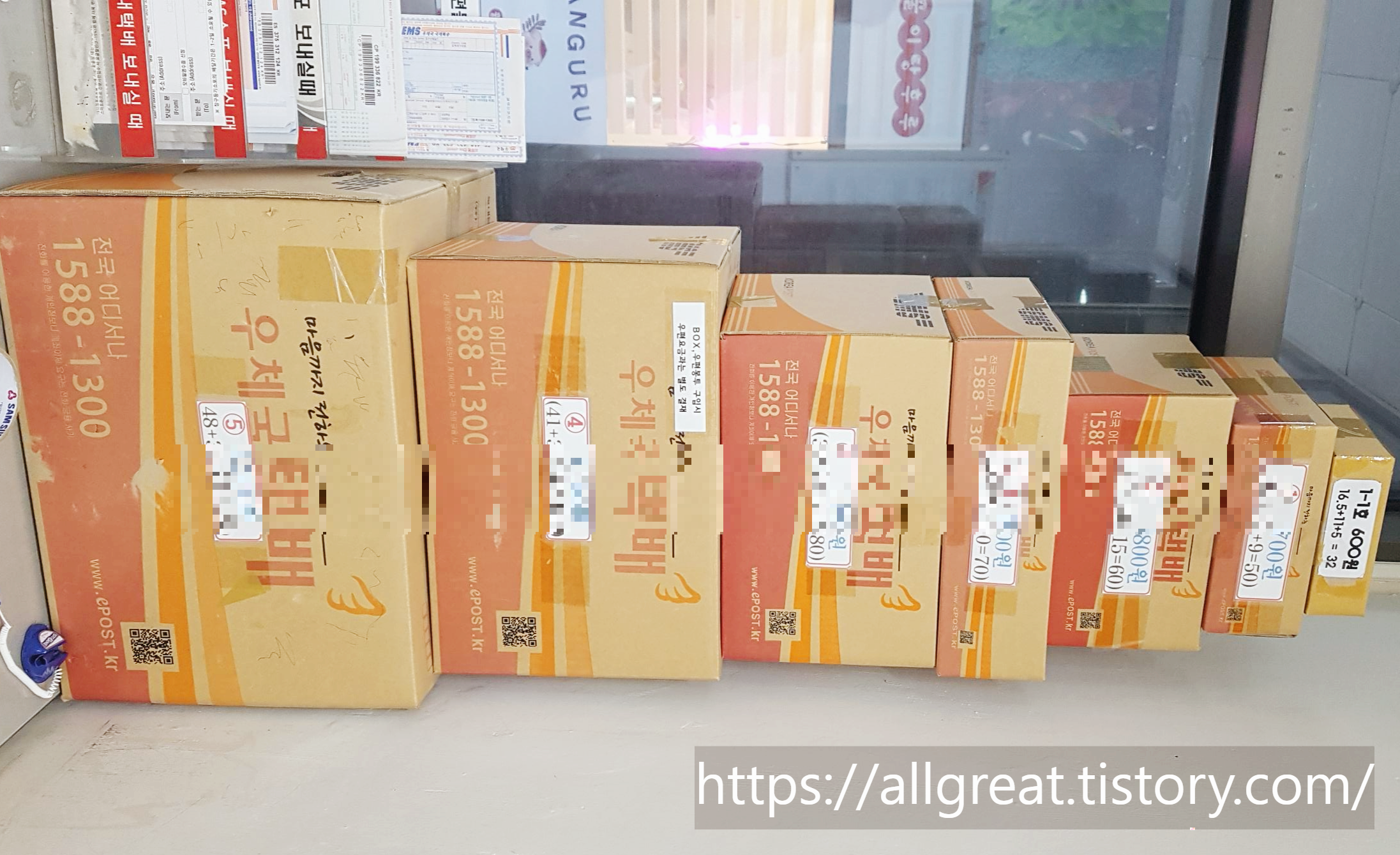 우체국 방문 택배접수의 최고의 장점은 늘 사이즈별로 택배박스가 구비되어 있으며, 택배포장에 필요한 뽁뽁이(완충제), 박스테이프, 가위, 매직, 볼펜 등 모든 물품들이 준비되어 있다는 것이다.