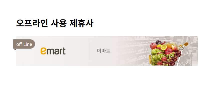 가장 많이 사용되는 제휴사가 아닐까 싶다. 오프라인에서 유일하게 아시아나포인트(마일리지)를 사용할 수 있는 이마트다.
