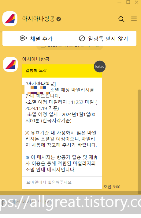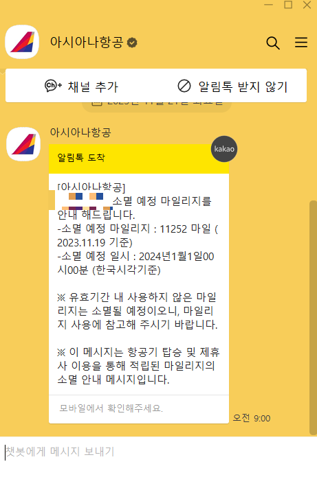 오전부터 아시아나 항공사로부터 카카오톡 메시지를 받았다. 아시아나항공 마일리지가 소멸 예정이니 그전에 마일리지를 사용하라는 안내였다.