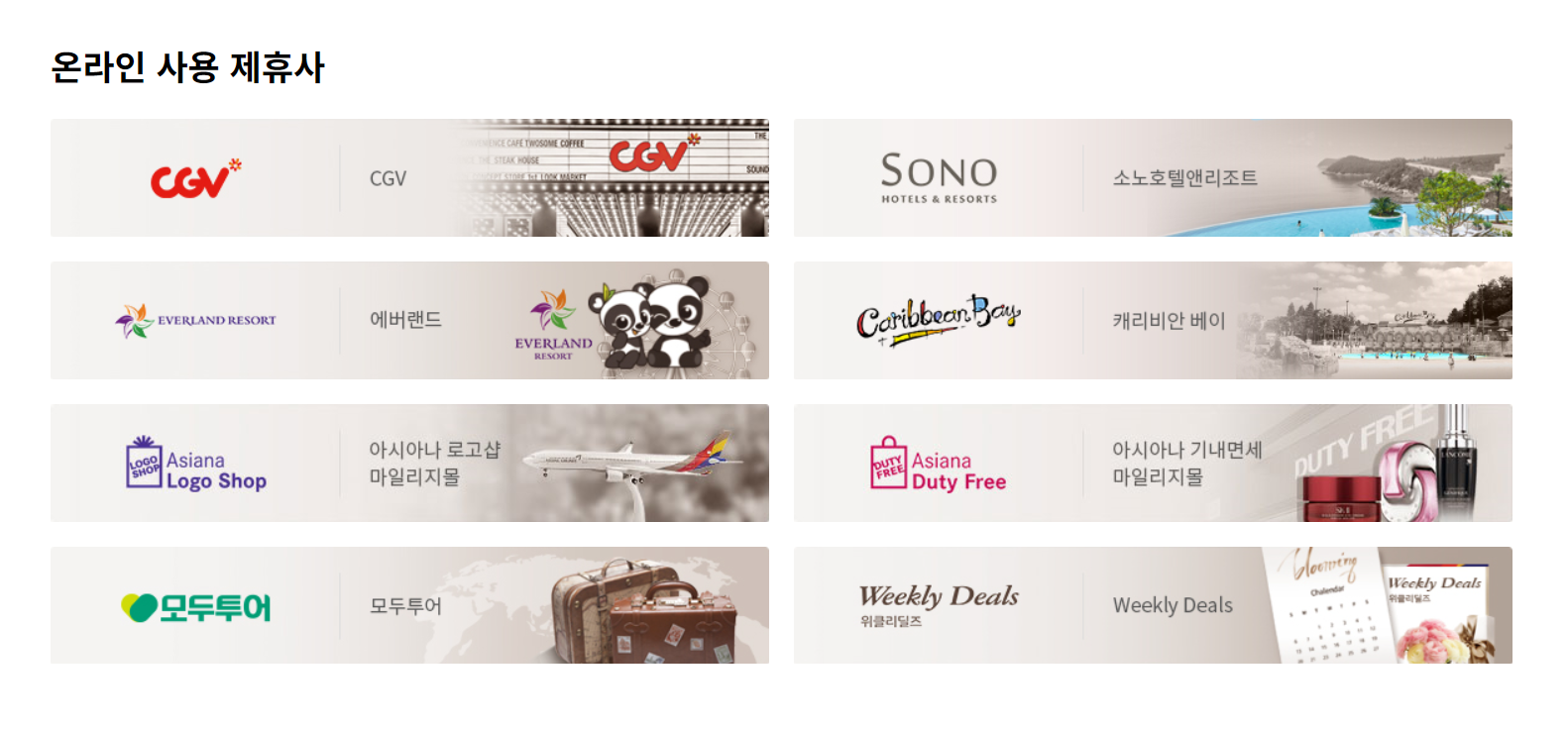 마일리지 사용방법으로 온라인 사용 제휴사는 CGV, 소노호텔앤리조트(SONO), 에버랜드, 캐리비안베이, 아시아나 로고샵 마일리지몰, 아시아나 기내면세 마일리지몰, 모두투어 여행사, 위클리딜즈가 있다.