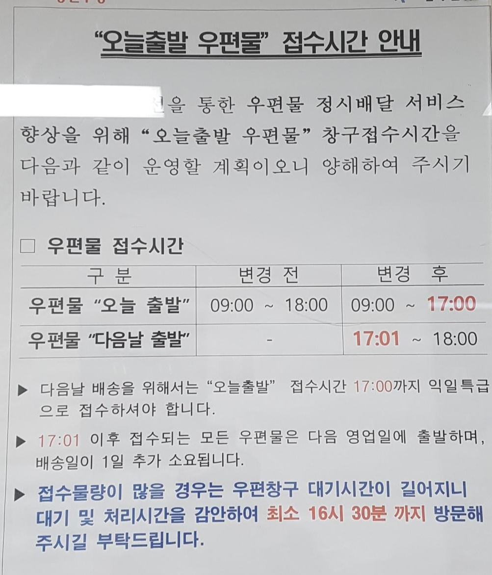 따라서 오늘출발 우편물 접수시간 보다 늦게 접수된 택배나 우편물은 다음날에 우체국으로 출발되기 때문에 최소 1일 이상 배송날짜가 늦어진다.