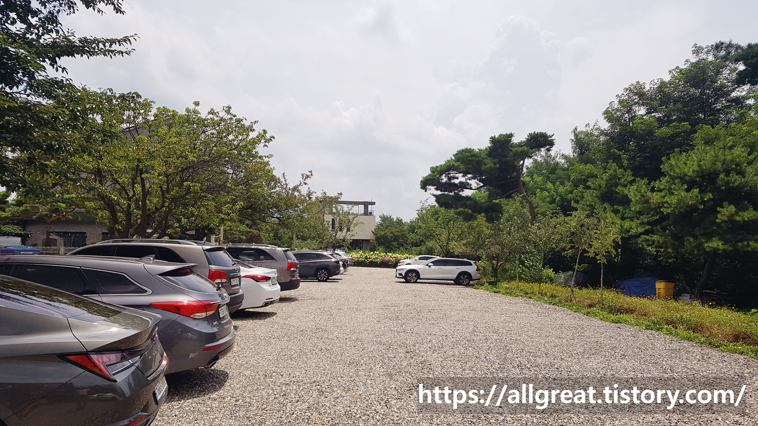 하남시 전망좋은카페 소진담은 카페 앞으로 넓은 주차장이 잘 갖추어져 있다. 노면에 주차라인이 그려진 장소도 있지만, 오프로드 자갈밭에 주차하는 곳도 있다.