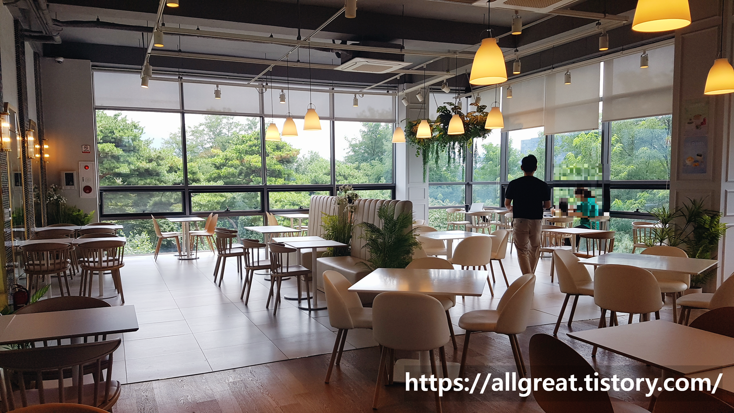 사방이 통유리창으로 시원하게 탁 트여있어서 실내임에도 야외 숲 속에 와있는 착각이 들 정도로 채광이 좋다.