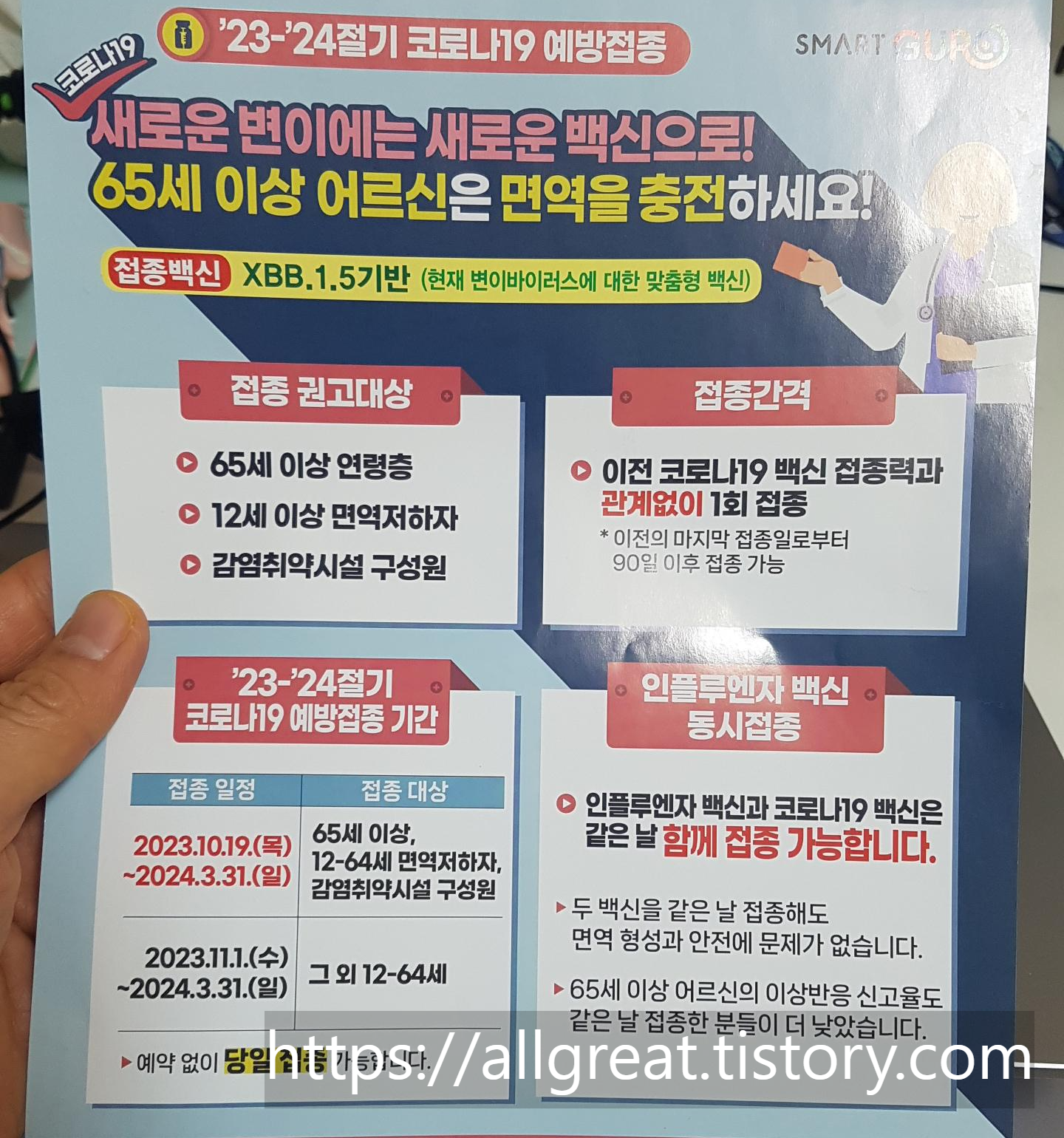 2023년~2024년 절기 코로나19 예방접종 기간, 대상자(나이), 예약, 독감(인플루엔자) 백신 동시접종 가능여부 등에 관한 정보를 소개한다.