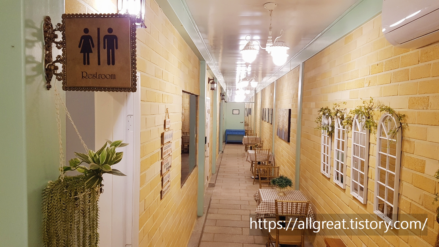화장실 입구 앞 통로에 마련된 테이블과 의자를 봐라. 피크닉 식사를 하여도 이상하지 않을 감성적인 식탁보와 테이블이다.
