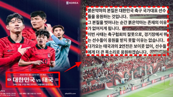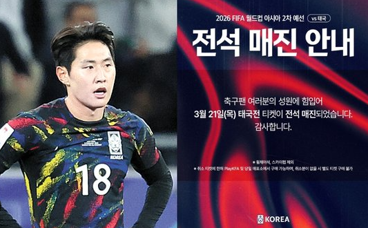 축구팬 분들의 성원에 힘입어 대국전 티켓이 전석 매진되었다며 감사의 메시지를 남긴 대한축구협회다.