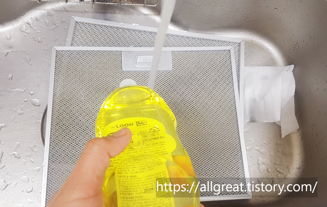 주방환풍기(후드) 필터 세척방법은 간단한다. 미지근한 온수에 주방세제 퐁퐁을 풀어서 거품을 만든 후 솔이나 수세미로 빡빡 문질러주면 된다.