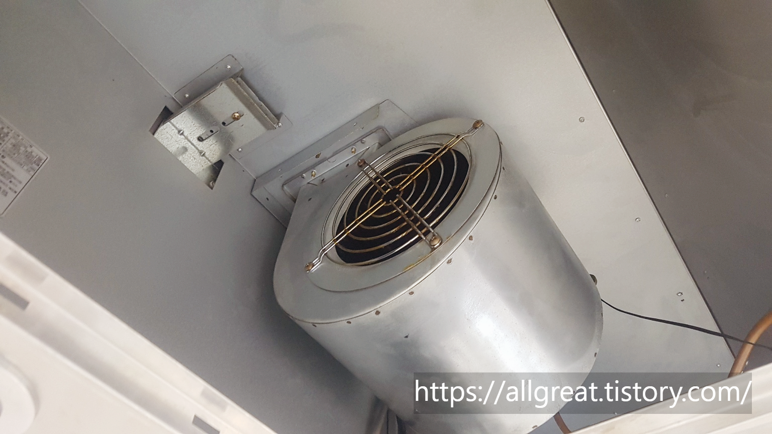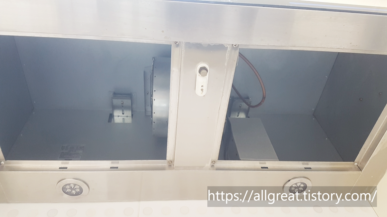 부엌 환풍기(후드)의 필터를 분리하면, 이처럼 후드의 내부를 들여다볼 수 있다. 큰 방안에 선풍기 한 대가 놓여있는 모습 같기도 하다.
