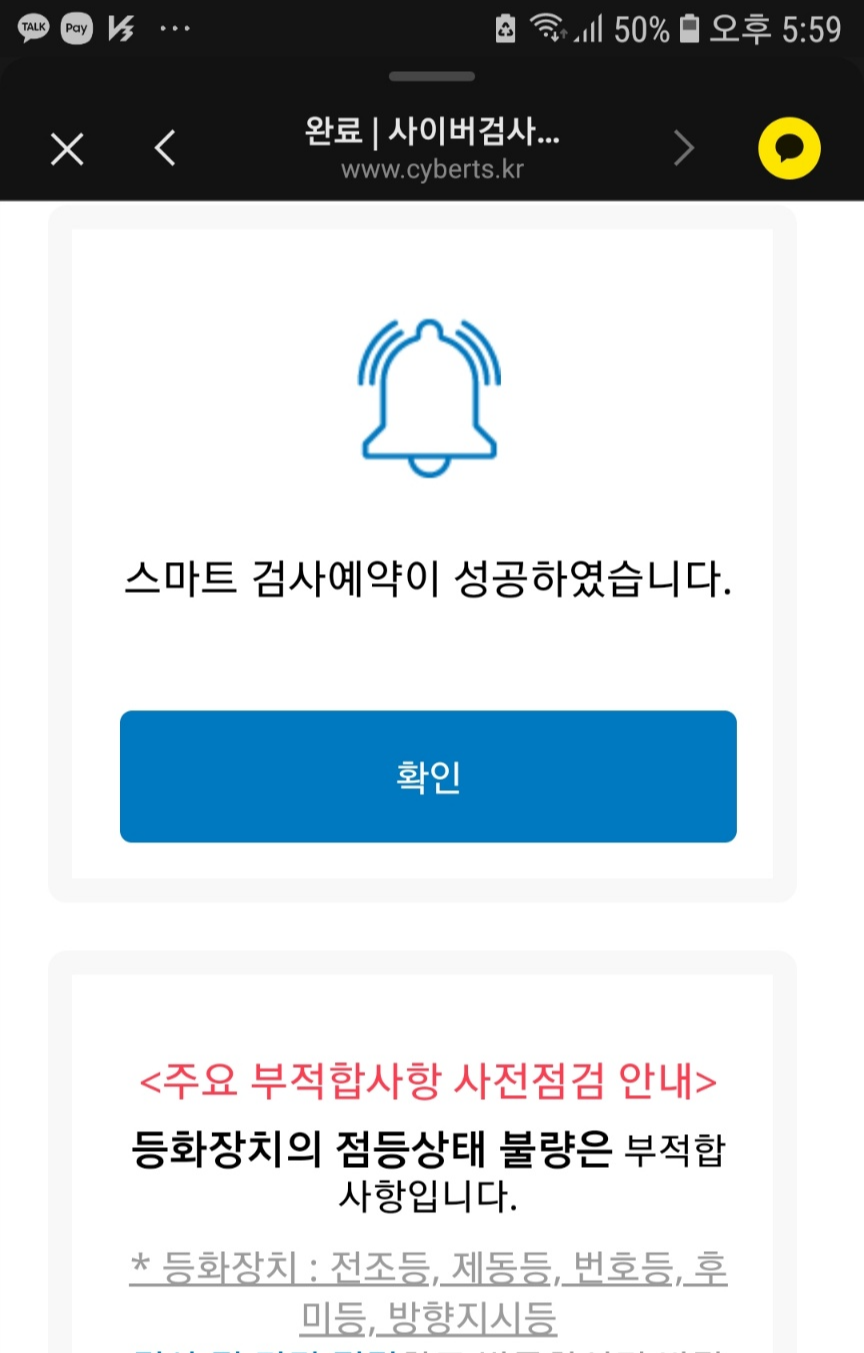 검사예약에 성공하였다는 문구까지 확인하였다면, 예약한 당일에 잊지 말고 예약한 자동차검사소에 방문하여 검사를 받으면 되다.