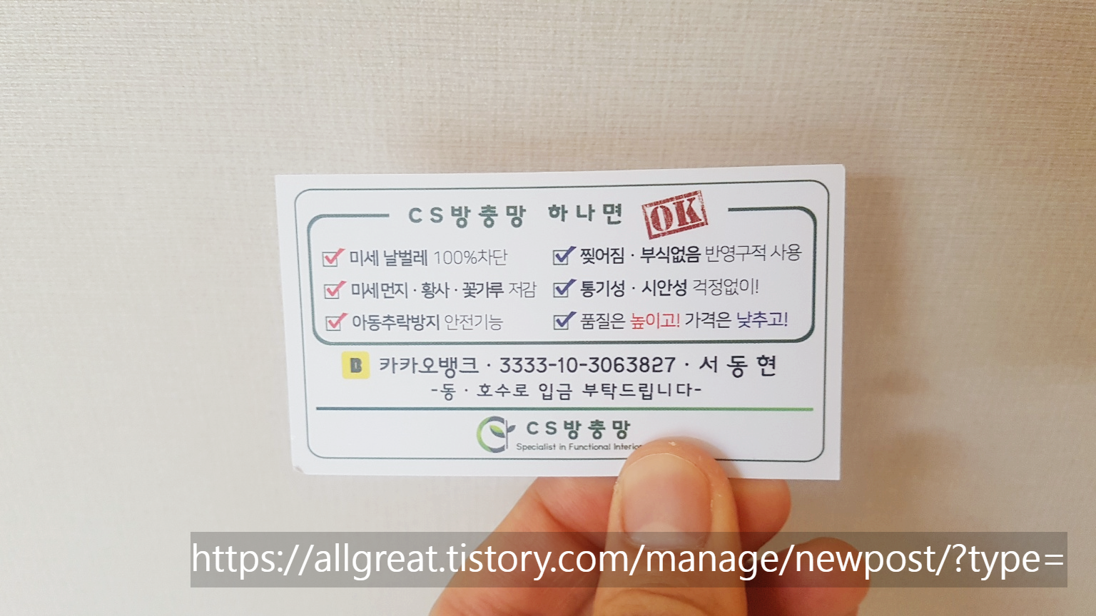 그렇게 7~8 업체와 밀도 있는 방충망시공 상담을 받아보았고, 결국 우리 집 미세방충망 시공권을 따낸 업체는 CS로 선정! (축하합니다 ㅎ)