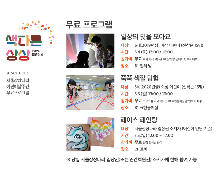 그래서 나처럼 어린이날 가볼만한곳을 물색하지만, 아직 정하지는 못한 부모들을 위해 도움 될만한 서울시 어린이날 행사 프로그램 정보를 공유한다.