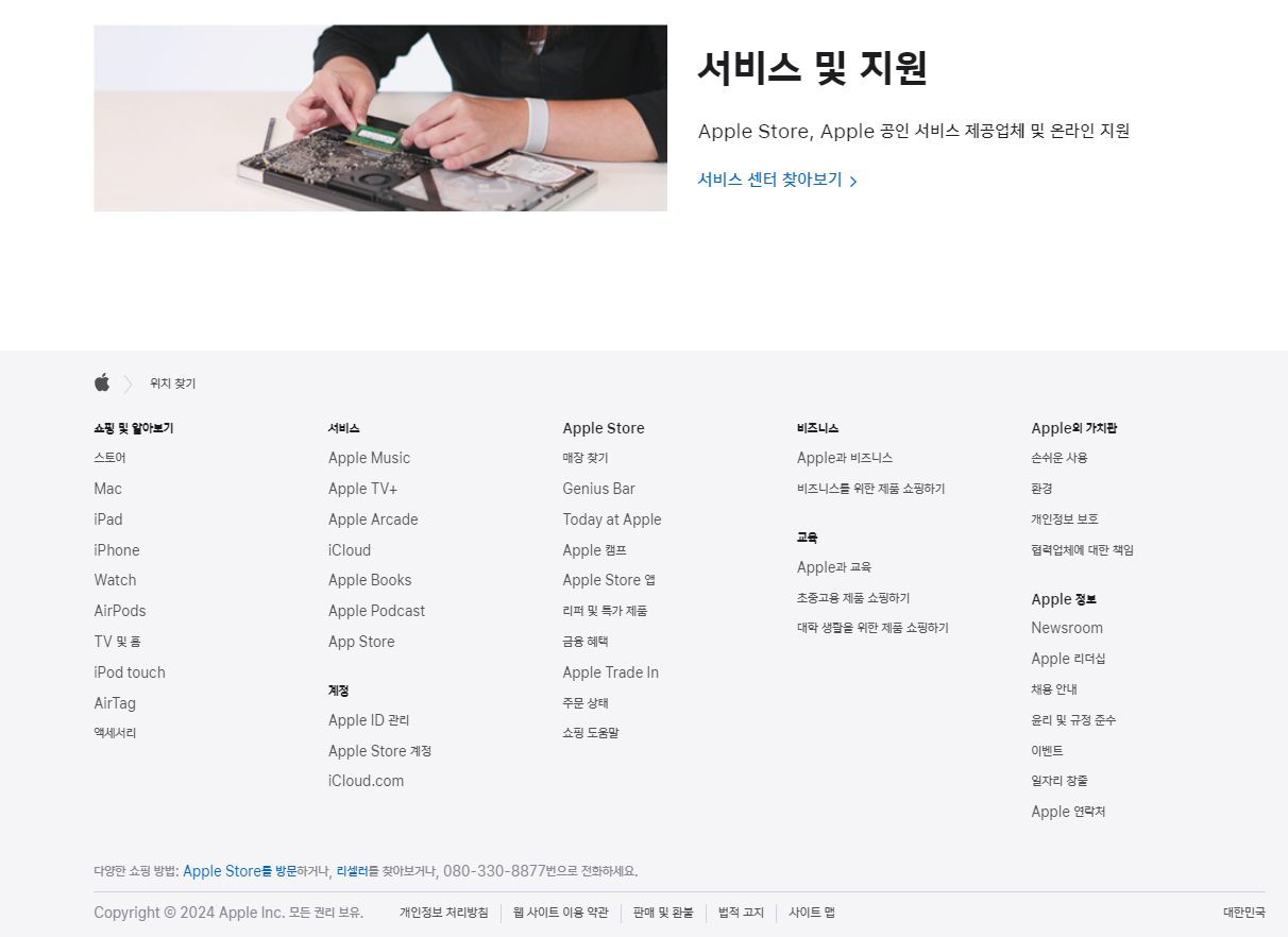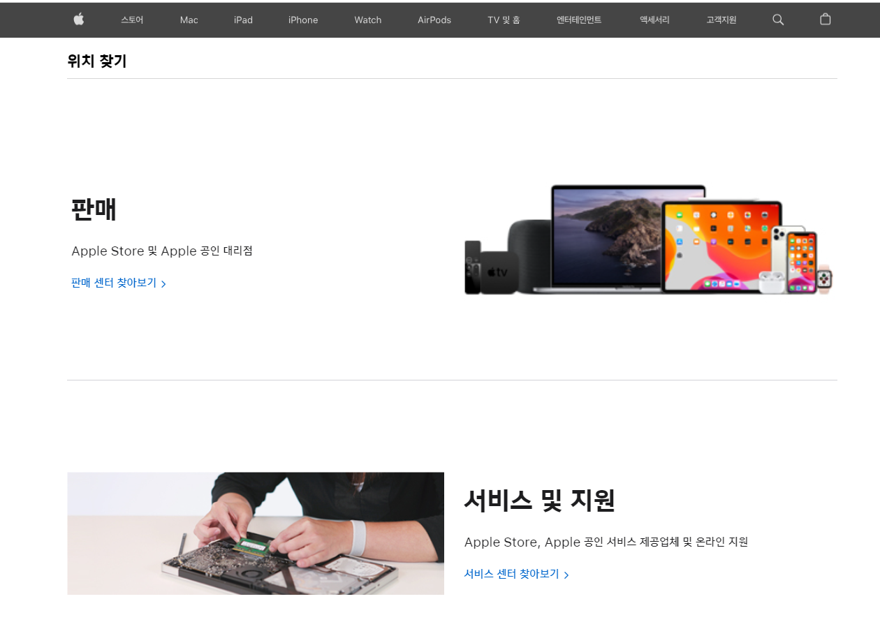 홈페이지 초기화면은 크게 '판매'와 '서비스 및 지원' 카테고리로 이뤄져 있는데, 나에게 가장 필요한 것은 아이폰 잠금푸는방법을 설명해 줄 애플 고객센터 상담사와 통화할 전화번호였다.