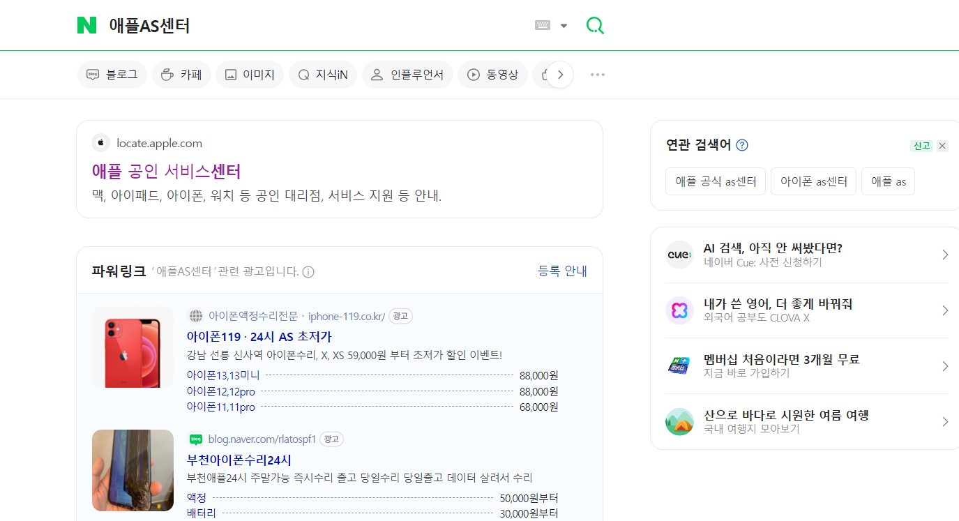 포털창에서 '애플AS센터'라고 검색하니, 바로 최상단에 애플공식서비스센터 사이트로 연결되는 링크 화면이 나왔다.