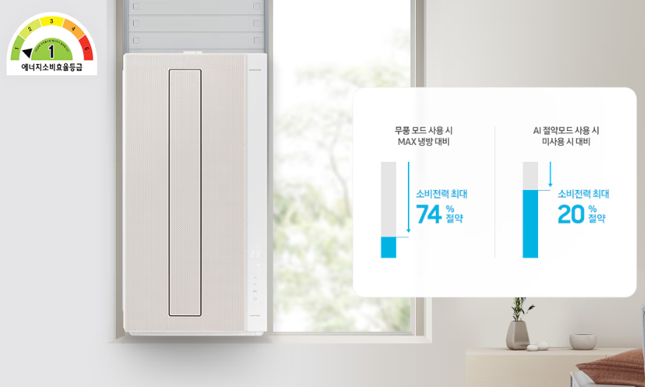 2024년 삼성 창문형에어컨은 무풍으로 가동할 때 최대 70% 이상의 절전 효과를 볼 수 있다.