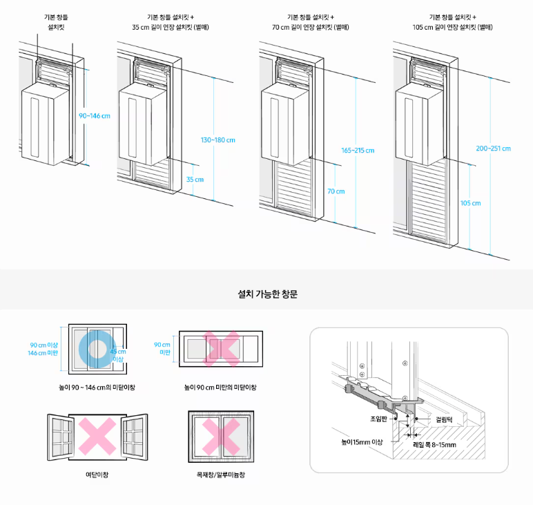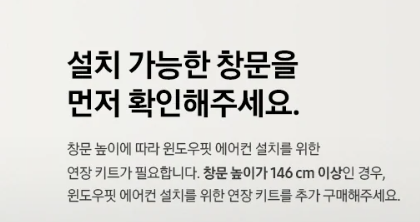 요약하면, 창문의 높이가 146cm 이상이면 기본설치가 불가능하지만, 설치가 안 되는 것은 아니다.