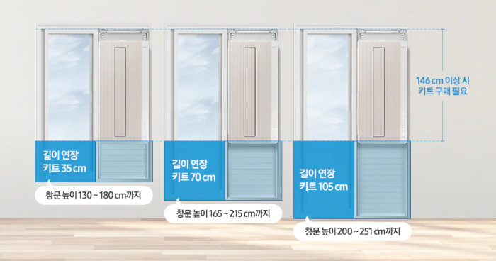 창문의 높이가 맞지 않을 때에는 연장키트를 추가로 구입하여 창문형에어컨을 설치할 수 있다.