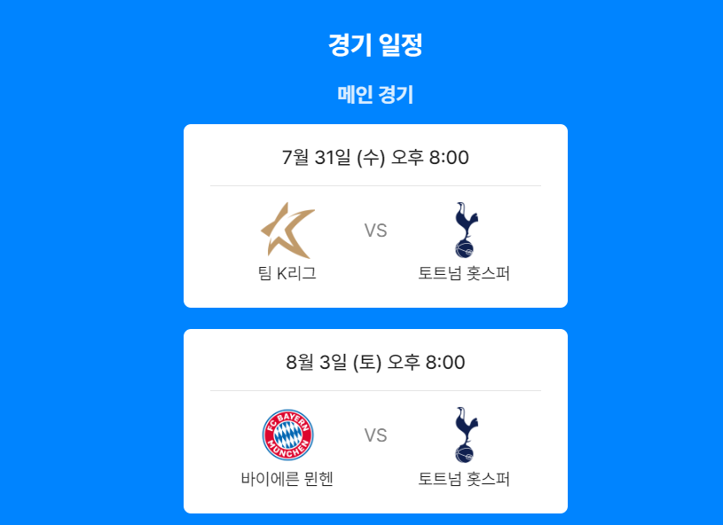 팀 K리그 토트넘 경기는 2024년 7월 31일(수) 오후 08:00에 열리며, 뮌헨 토트넘 친선경기는 8월 3일(토) 오후 08:00에 시작한다.