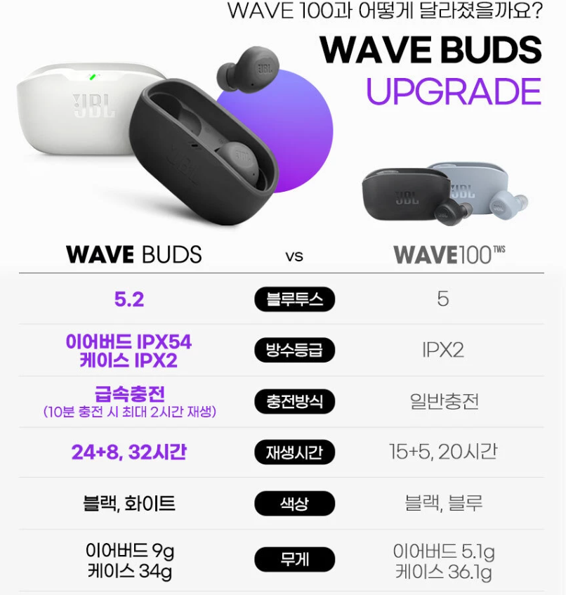 이전 모델인 WAVE100과 비교했을 때, WAVE BUDS는 방수기능이 향상되었고, 재생시간도 32시간으로 크게 늘어났다.