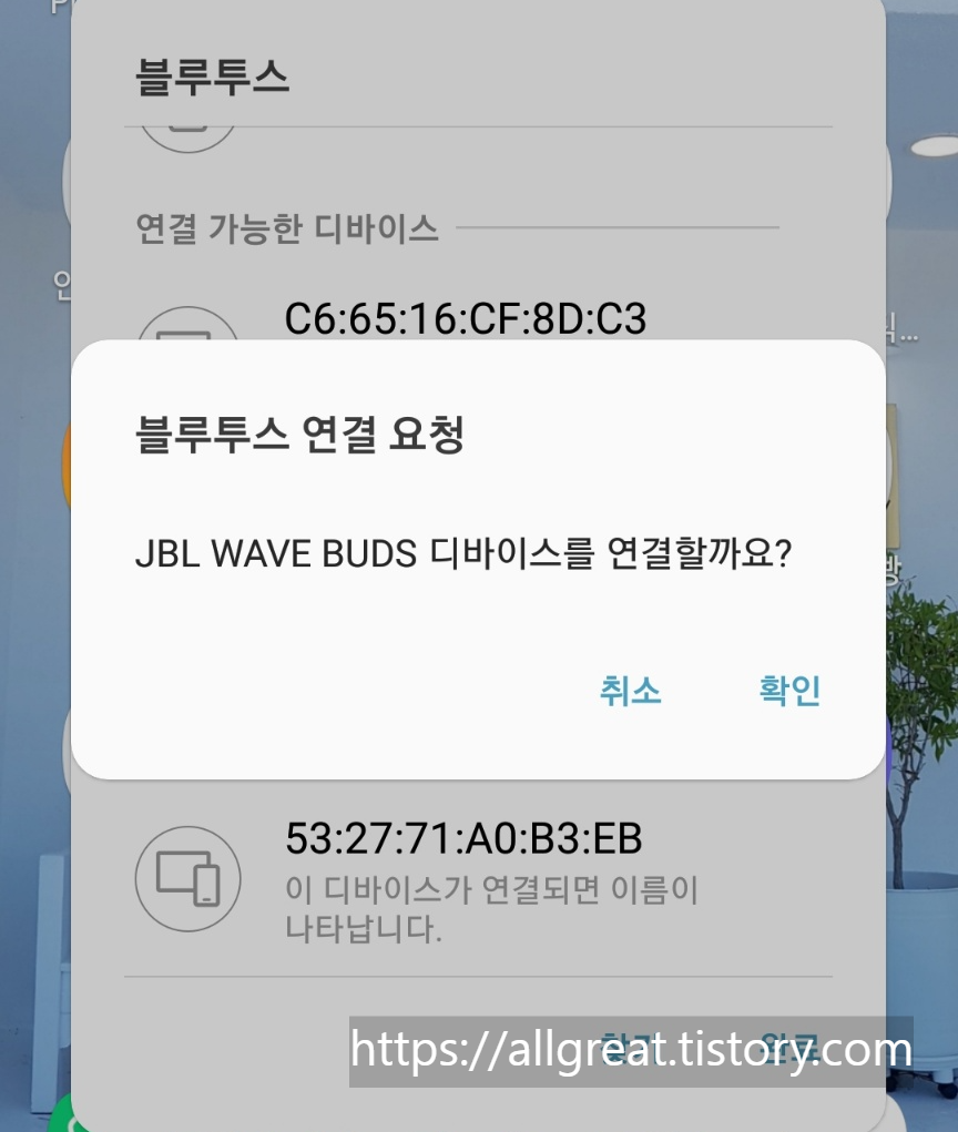 'JBL WAVE BUDS'를 눌렀다면, 디바이스를 연결할까요?라는 메시지가 뜬다.