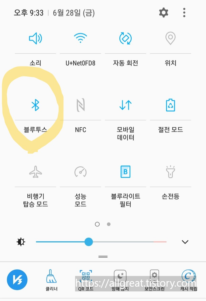 위 사진의 모습처럼 '블루투스'를 눌러서 켠다.