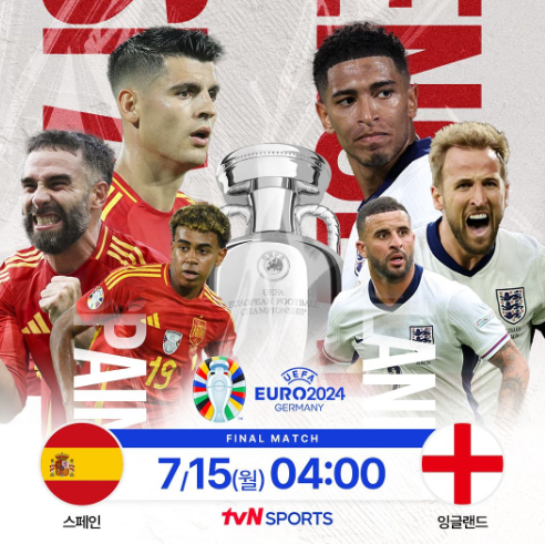 유로 2024 결승전 잉글랜드 스페인 경기는 tvn(티브앤), tvNsports, TNING(티빙)를 통해서 실시간 생중계로 OTT, 케이블 TV, 모바일 등 기기로 시청할 수 있다.