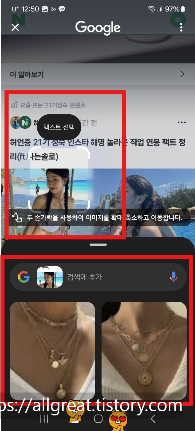 바로 구글과 연동되어 이미지검색이 진행되어 사진 속 목걸이를 검색해 줬다.