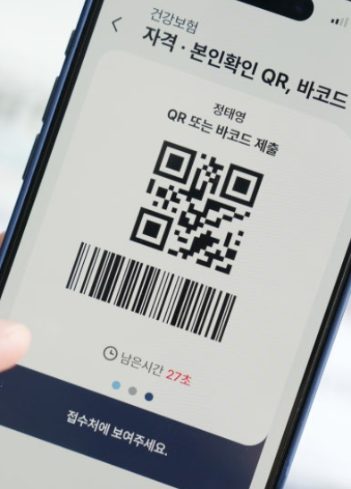 모바일 건강보험증 앱 설치를 마쳤다면, 위 사진처럼 병원에서 자신의 고유 QR화면을 보여주면 된다.