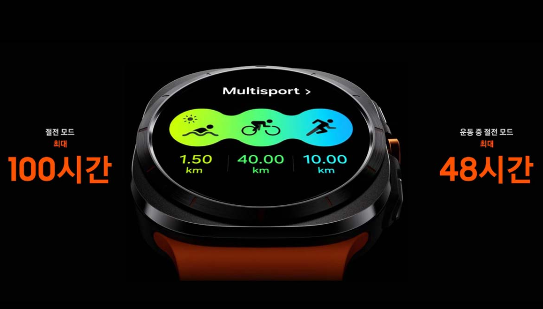 갤럭시 울트라워치은는 절전모드를 사용할 경우 최대 100시간 동안 사용할 수 있다.
