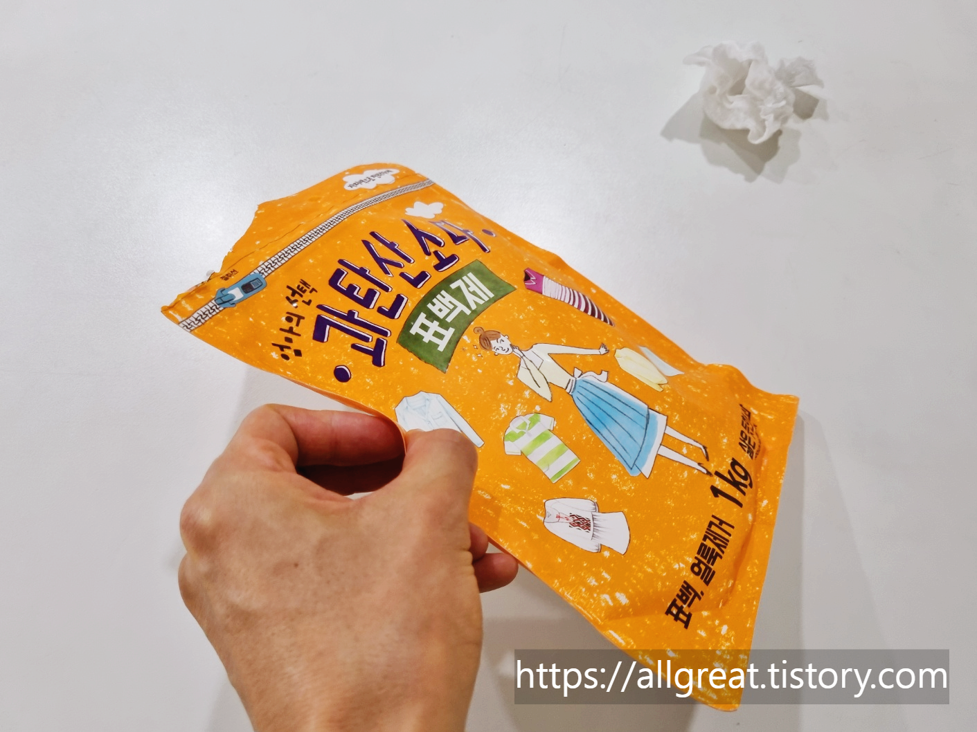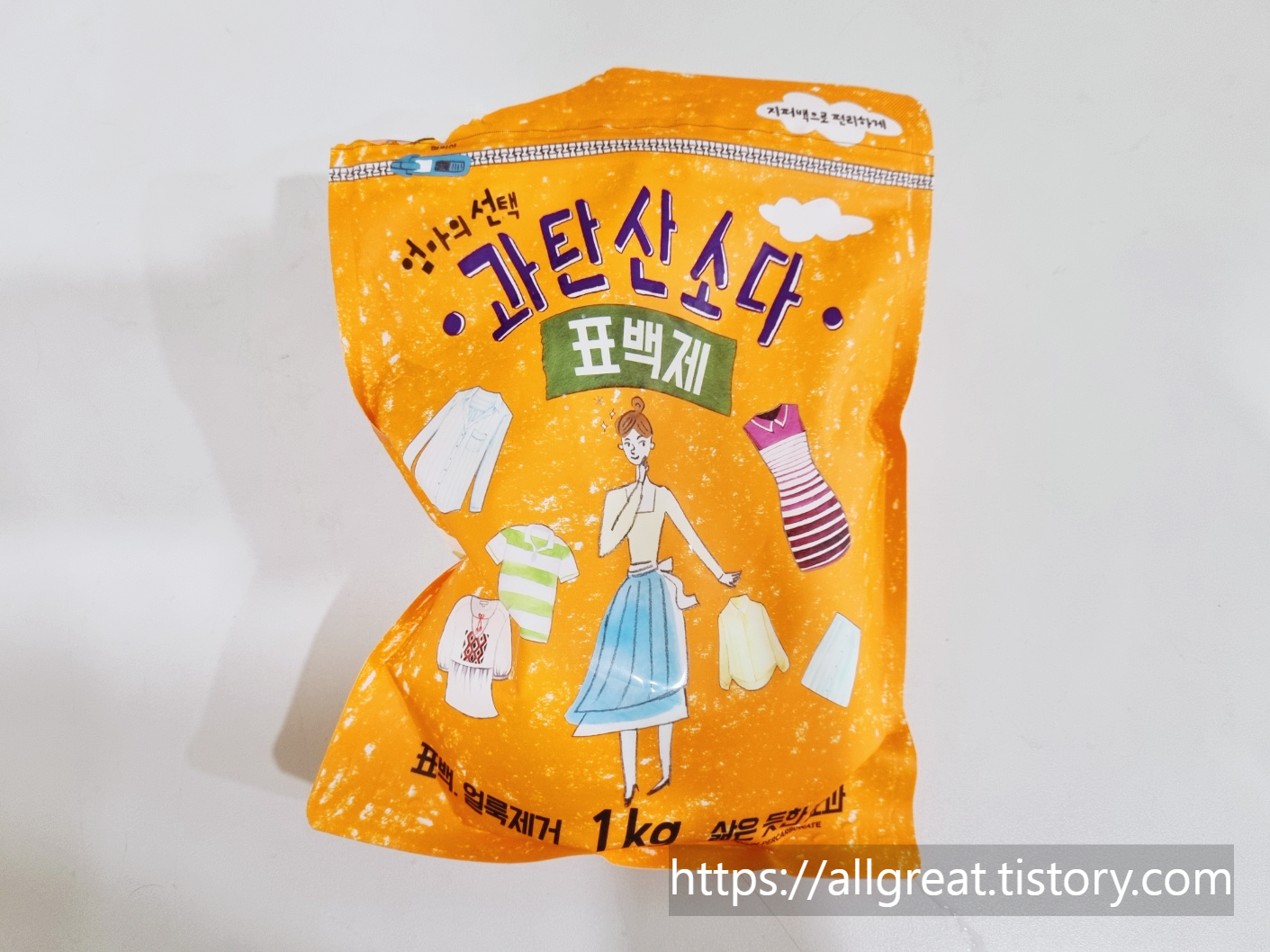 표백제로 많이 사용하는 '과탄산소다'다. 이전 포스팅에서도 다루었듯이 과탄산소다는 이제는 없어서는 안 될 나의 살림용품이 되어버렸다.
