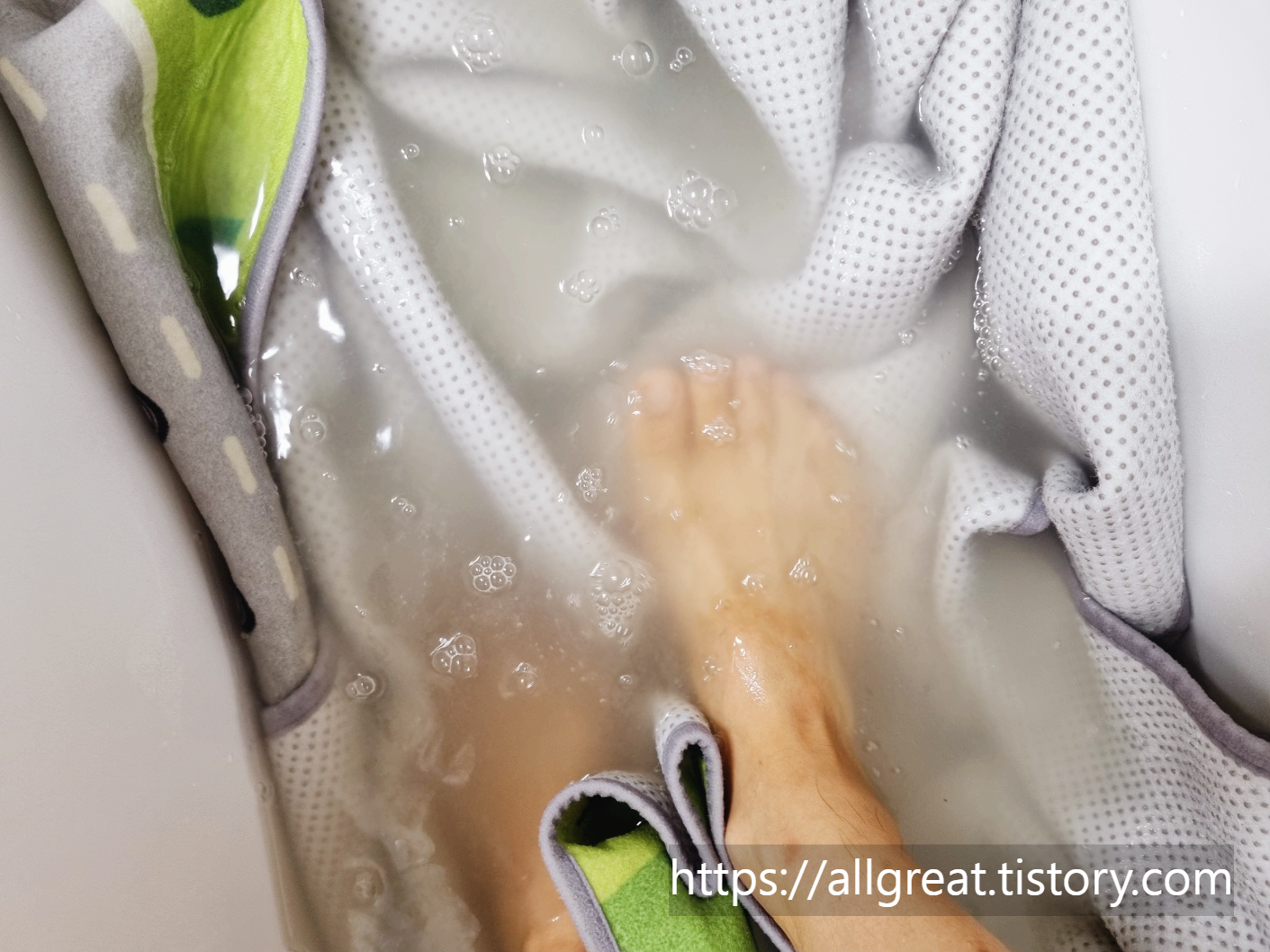 여러 방법을 찾아서 시도를 해봤었지만, 소요되는 시간 및 노동 대비 가장 효과적인 방법은 발로 세탁물을 밟아주는 방법이었다.