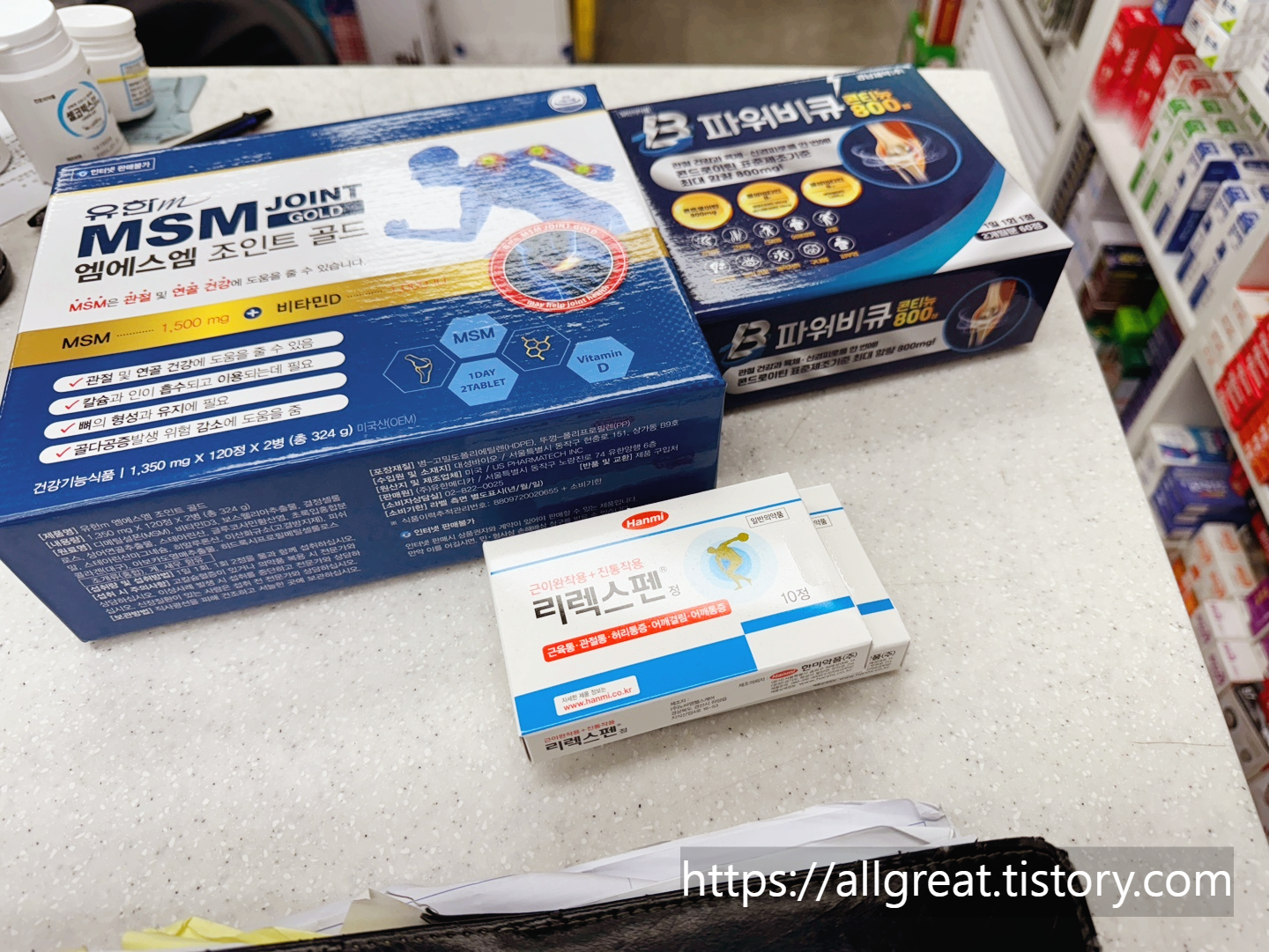 무릎연골 퇴행성 관절염과 골다공증 등을 앓고 계신 부모님약으로 구입한 MSM 조인트 골드, B 파워비큐, 리렉스펜이다.