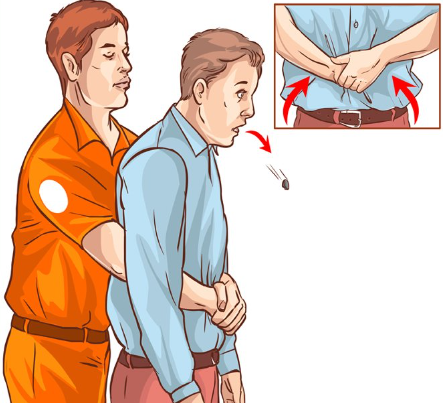 - 성인: 환자의 뒤에서 양팔로 감싸고, 한쪽 주먹을 배꼽과 갈비뼈 사이에 넣고 다른 손으로 주먹을 쥐고 대각선 위쪽을 향하여 강하게 밀쳐 올린다.