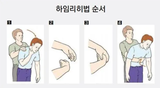 하임리히법은 떡과 같은 이물질이 기도를 막았을 때 이물질을 제거하는 응급처치 방법이다.