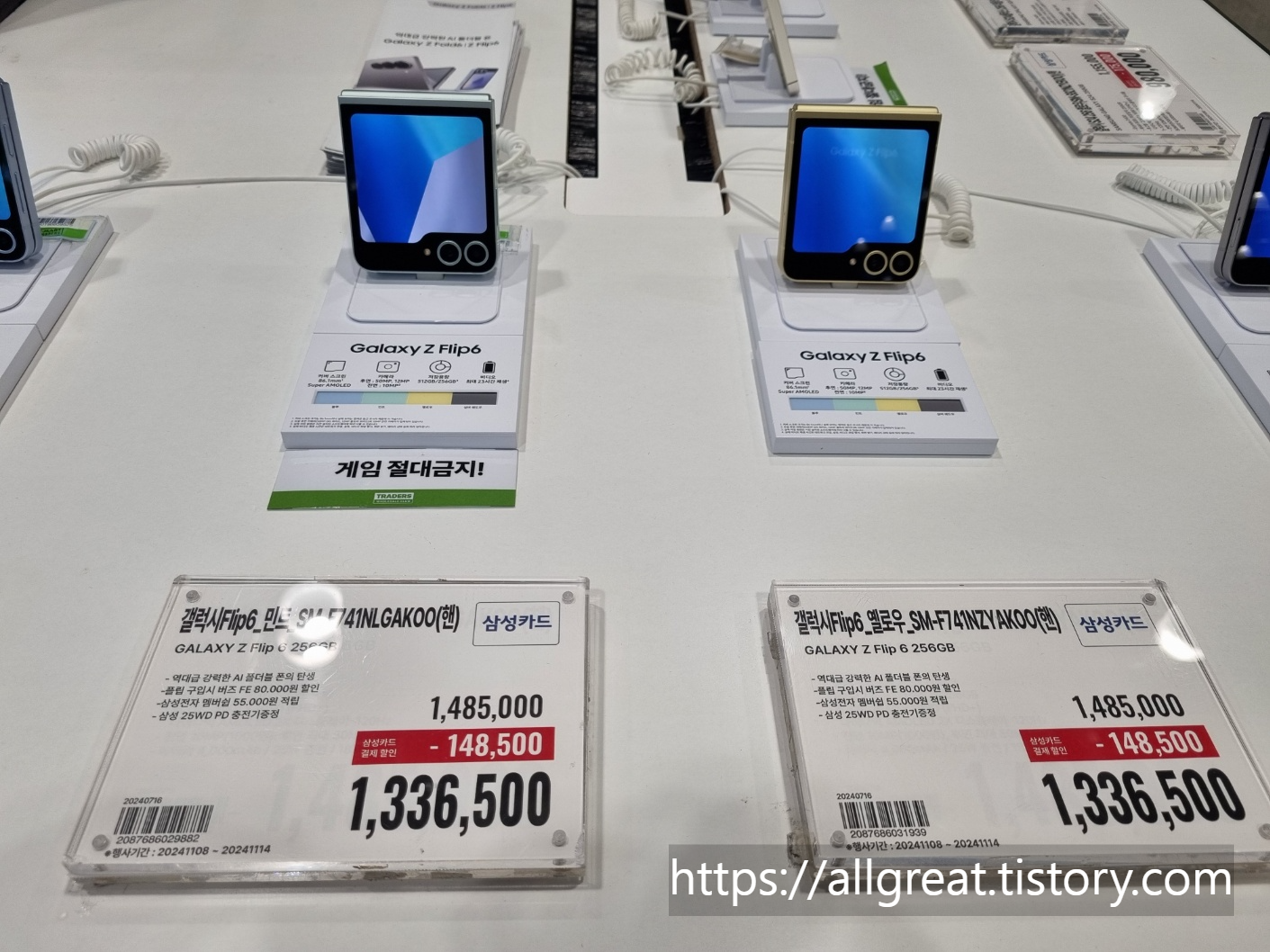 최근 마트 삼성전자 가전제품 코너에서 보았던 갤럭시플립6의 가격은 1,485,000원이었습니다.