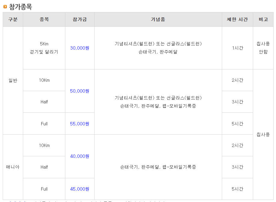 하프 5만 원, 10km 5만원, 5km 4만 원.
