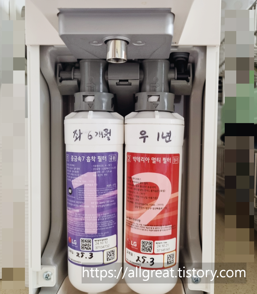 좌측의 중금속흡착필터는 6개월 주기로, 우측의 박테리아멀티필터는 1년마다 셀프로 직접 교체해 주면 됩니다.