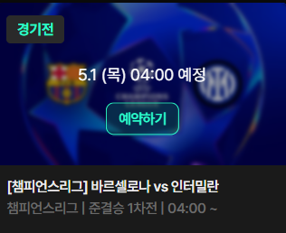 마찬가지로 다른 챔스(챔피언스리그) 준결승 4강전 경기인 바르셀로와 인터밀란 경기도 사전에 예약하기 서비스로 경기를 놓치지 않고 알람을 받아볼 수 있다.